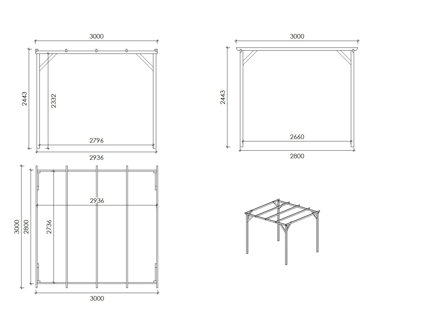 Cochera CAR12 de ancho de 3 m, produndidad de 3 m y altura de entrada de m puede utilizarse como tejado para una plaza de aparcamiento o, por ejemplo, como tejado de terraza. El montaje de la cochera, gracias a las instrucciones adjuntas al producto, no causa mayores problemas.