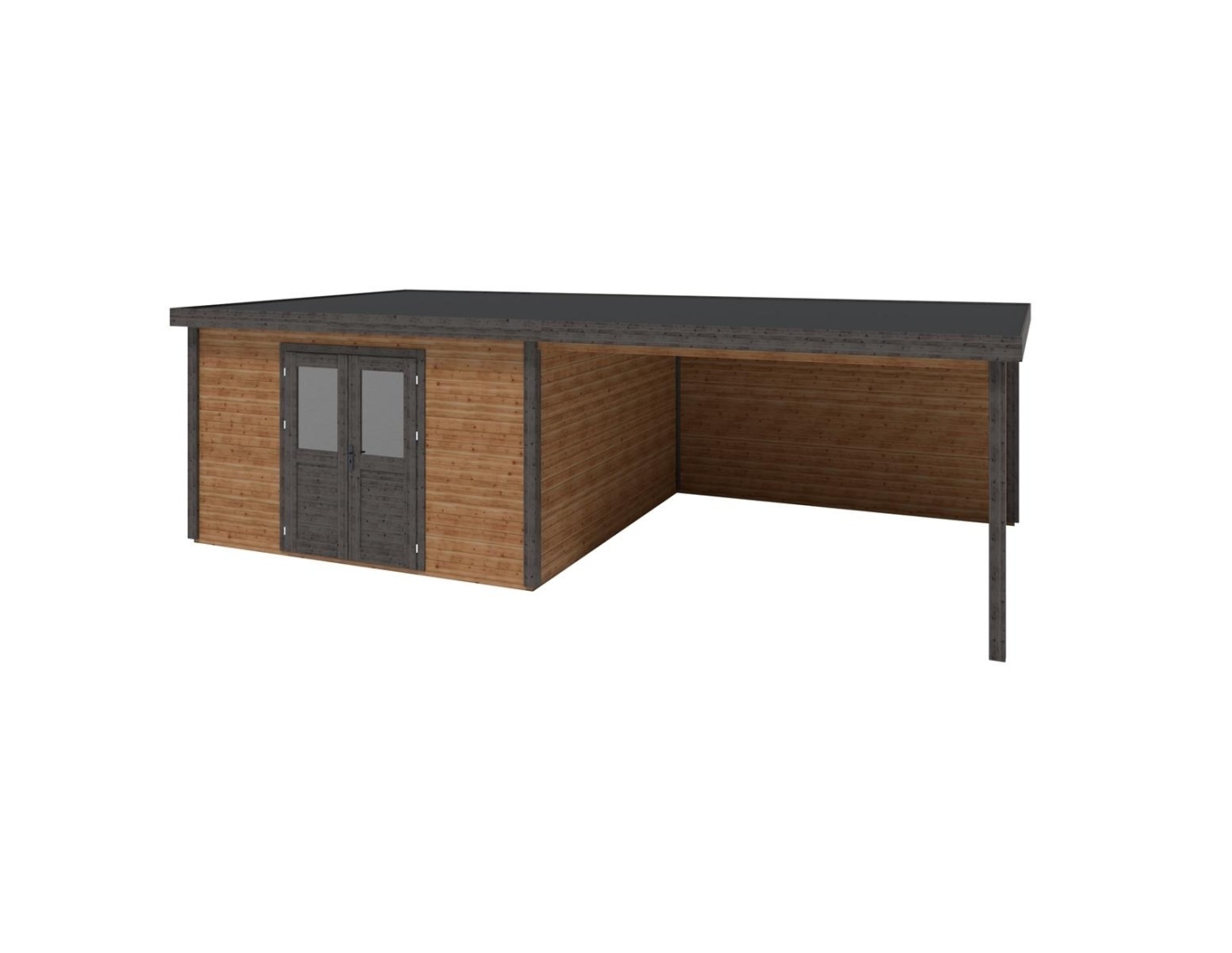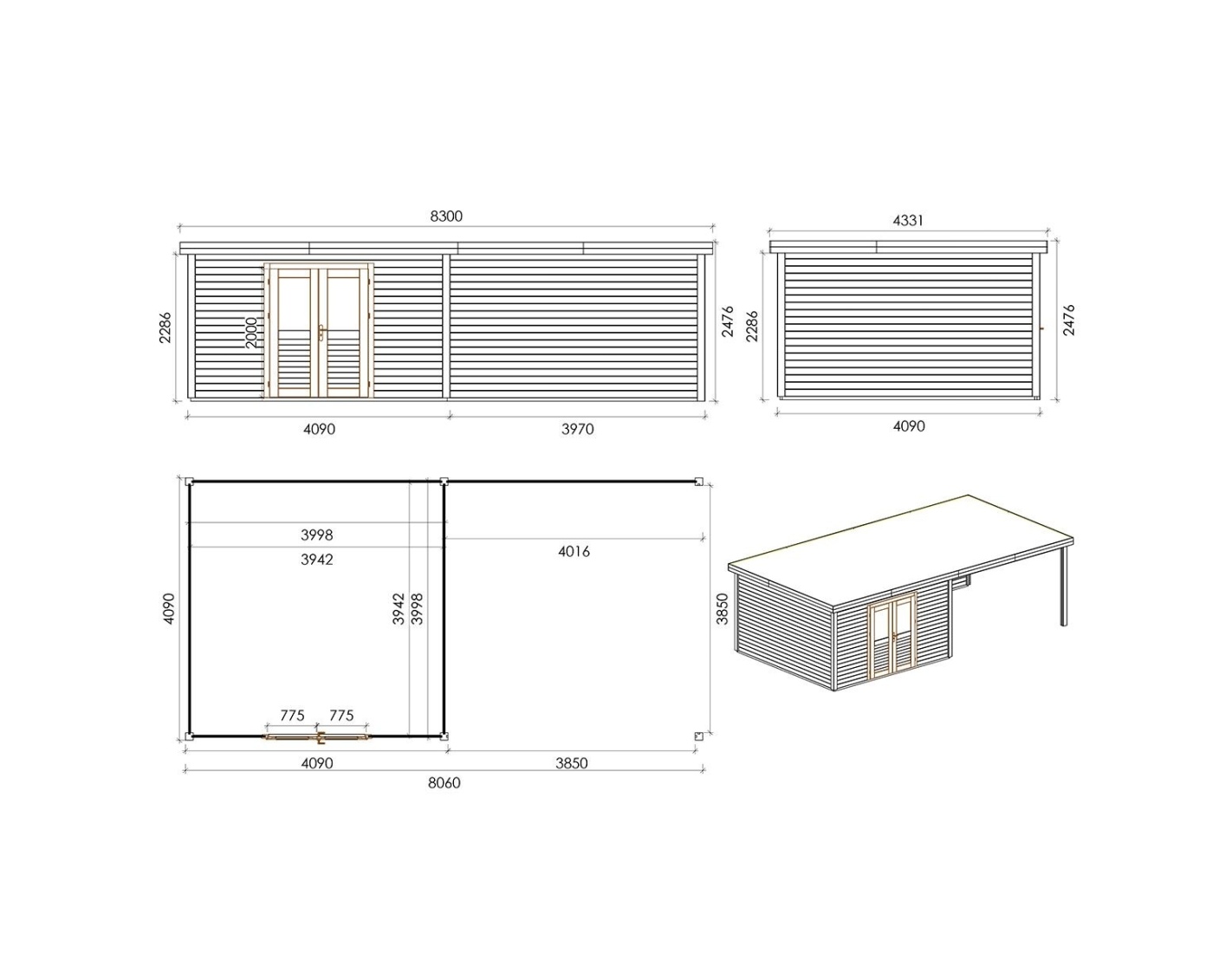 Caseta de madera para herramientas 000208 de superficie de 32.96 m2, ancho de 8.06 m, profundidad de 4.09 m y espesor de pared de 28 mm. La caseta es fácil de montar, las instrucciones de montaje están incluidas.