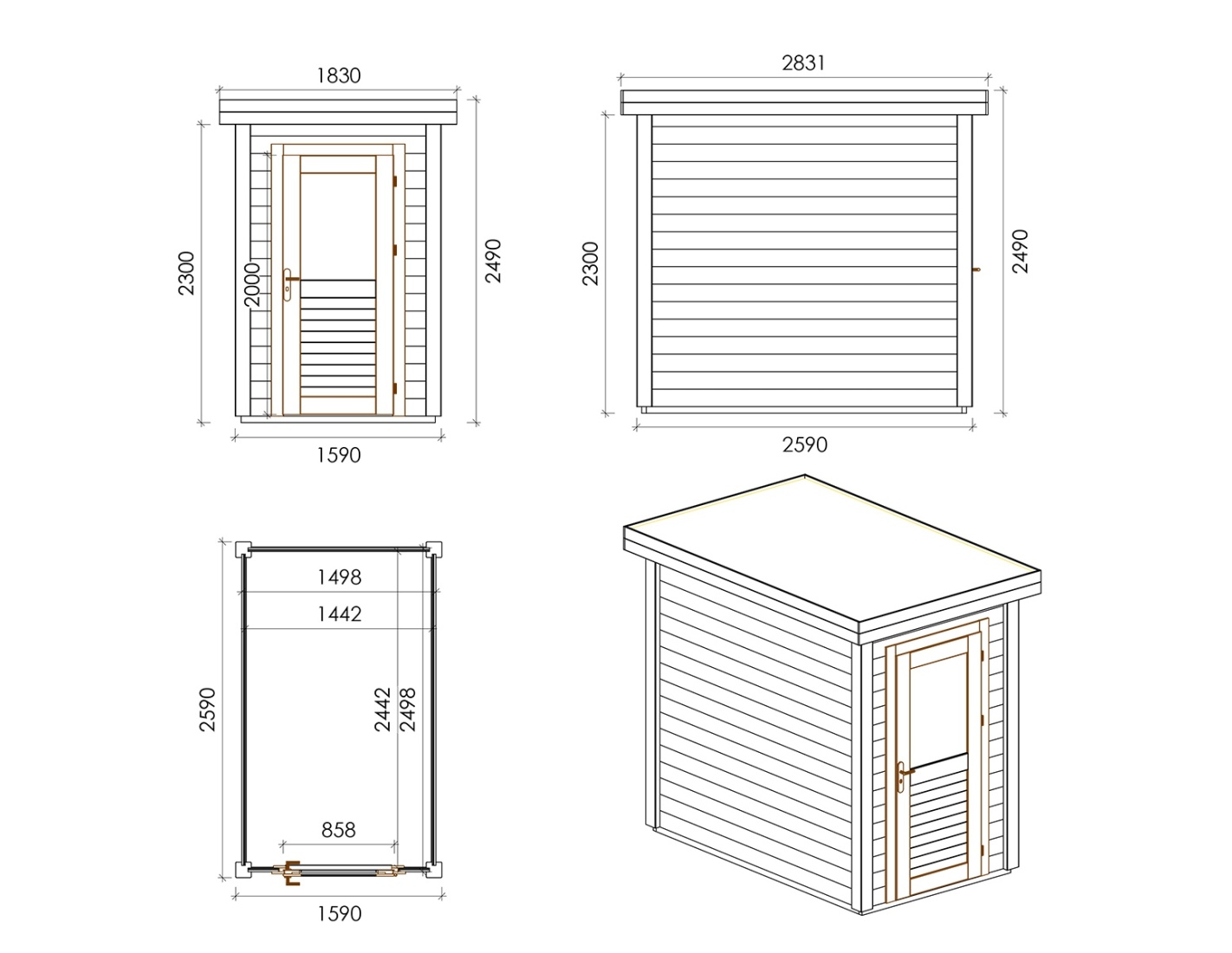 Caseta de madera para herramientas 000110 de superficie de 4.11 m2, ancho de 1.59 m, profundidad de 2.59 m y espesor de pared de 28 mm. La caseta es fácil de montar, las instrucciones de montaje están incluidas.