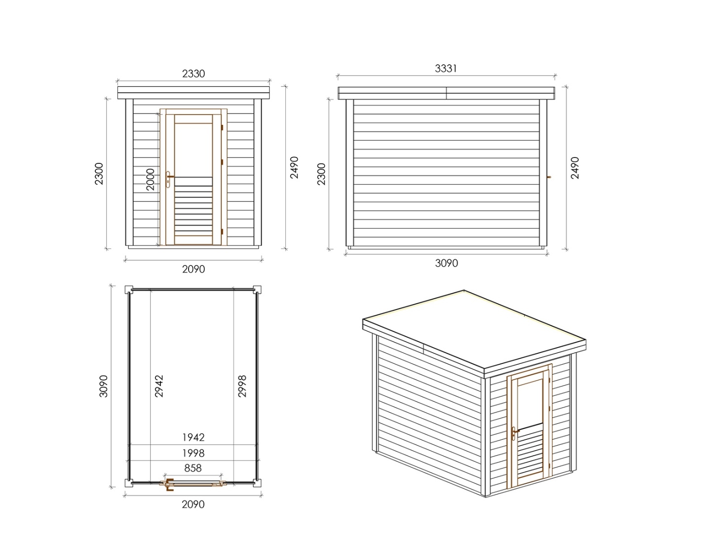 Caseta de madera para herramientas 000115 de superficie de 6.46 m2, ancho de 2.09 m, profundidad de 3.09 m y espesor de pared de 28 mm. La caseta es fácil de montar, las instrucciones de montaje están incluidas.