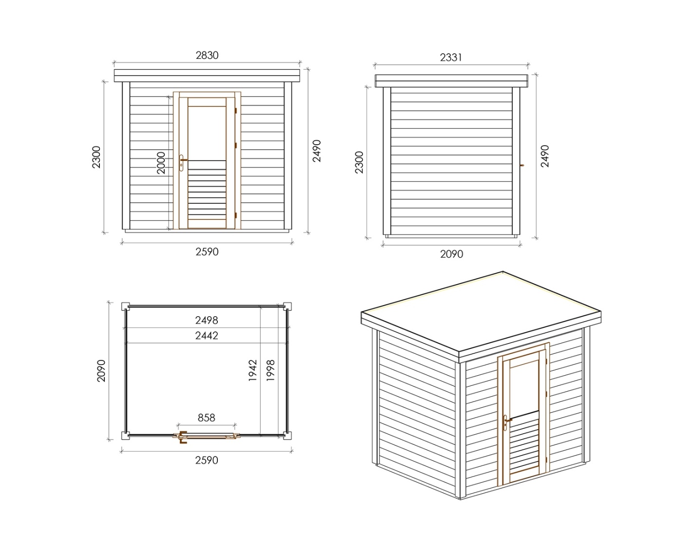 Caseta de madera para herramientas 000117 de superficie de 5.41 m2, ancho de 2.59 m, profundidad de 2.09 m y espesor de pared de 28 mm. La caseta es fácil de montar, las instrucciones de montaje están incluidas.