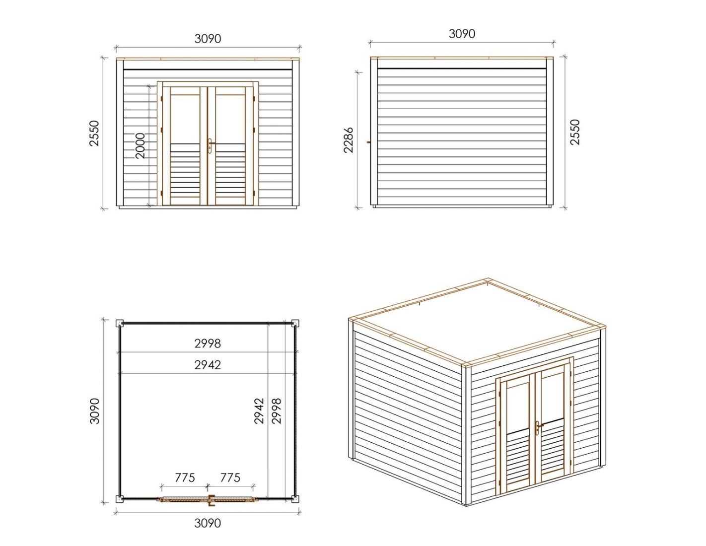 Caseta de madera para herramientas 000170 de superficie de 9.55 m2, ancho de 3.09 m, profundidad de 3.09 m y espesor de pared de 28 mm. La caseta es fácil de montar, las instrucciones de montaje están incluidas.