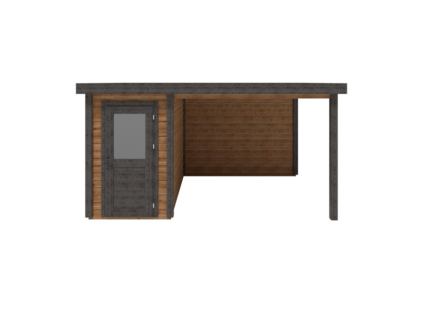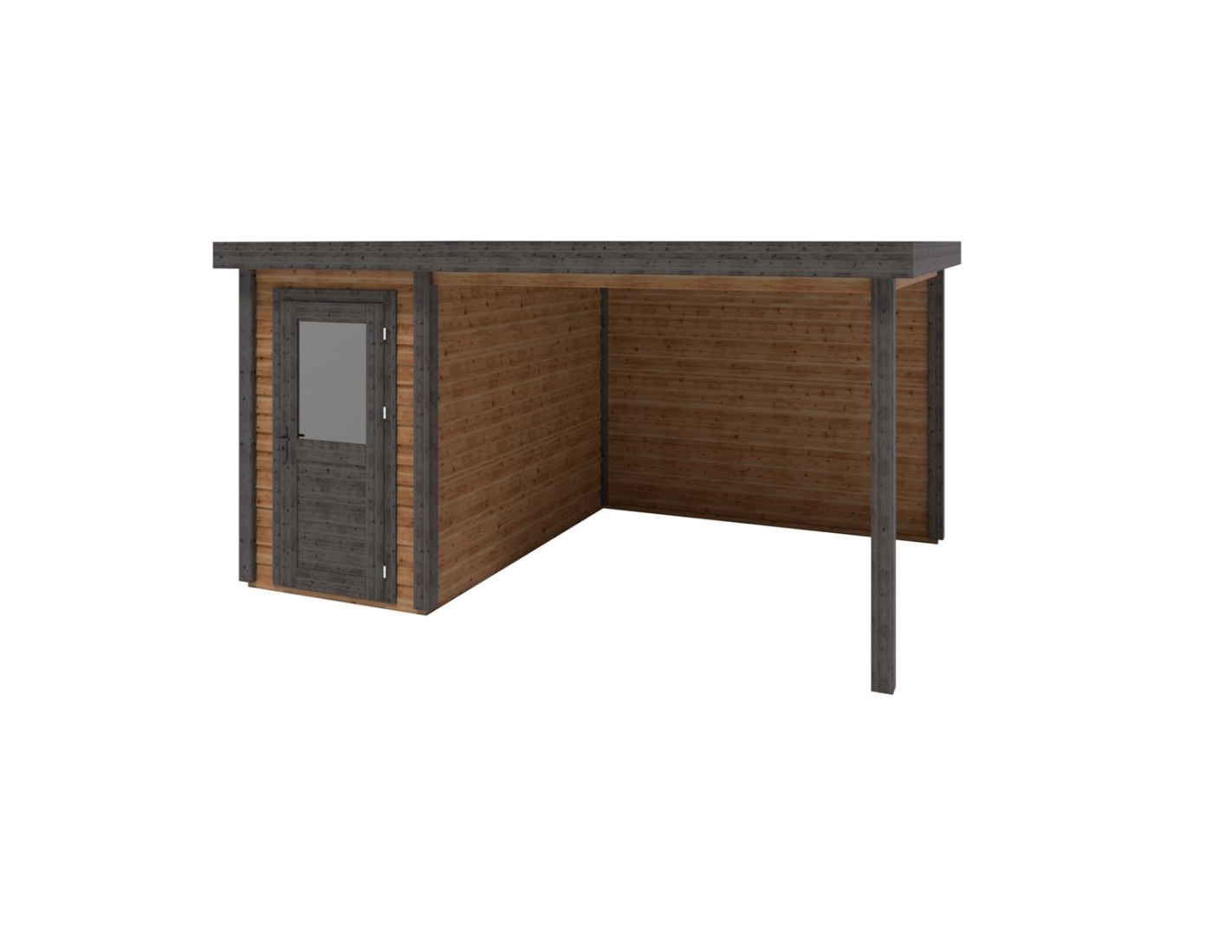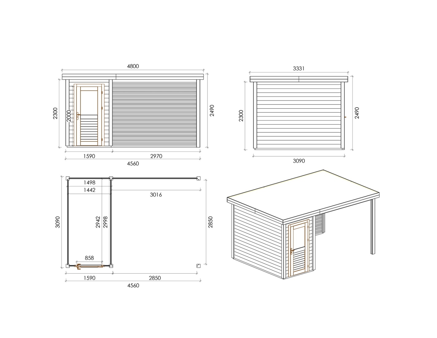 Caseta de madera para herramientas 000135 de superficie de 14.09 m2, ancho de 4.56 m, profundidad de 3.09 m y espesor de pared de 28 mm. La caseta es fácil de montar, las instrucciones de montaje están incluidas.