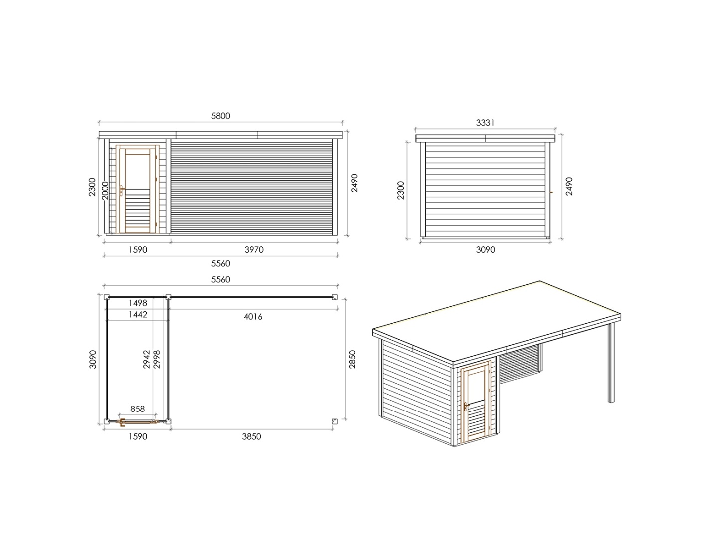 Caseta de madera para herramientas 000136 de superficie de 17.18 m2, ancho de 5.56 m, profundidad de 3.09 m y espesor de pared de 28 mm. La caseta es fácil de montar, las instrucciones de montaje están incluidas.