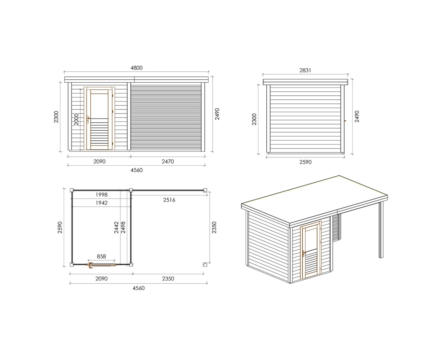 Caseta de madera para herramientas 000137 de superficie de 11.81 m2, ancho de 4.56 m, profundidad de 2.59 m y espesor de pared de 28 mm. La caseta es fácil de montar, las instrucciones de montaje están incluidas.