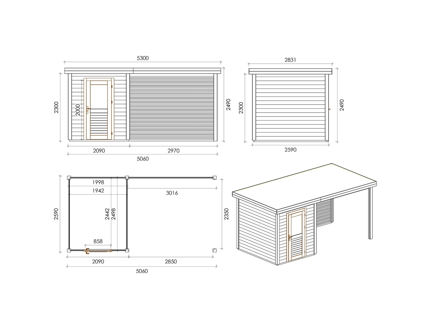 Caseta de madera para herramientas 000138 de superficie de 13.1 m2, ancho de 5.06 m, profundidad de 2.59 m y espesor de pared de 28 mm. La caseta es fácil de montar, las instrucciones de montaje están incluidas.