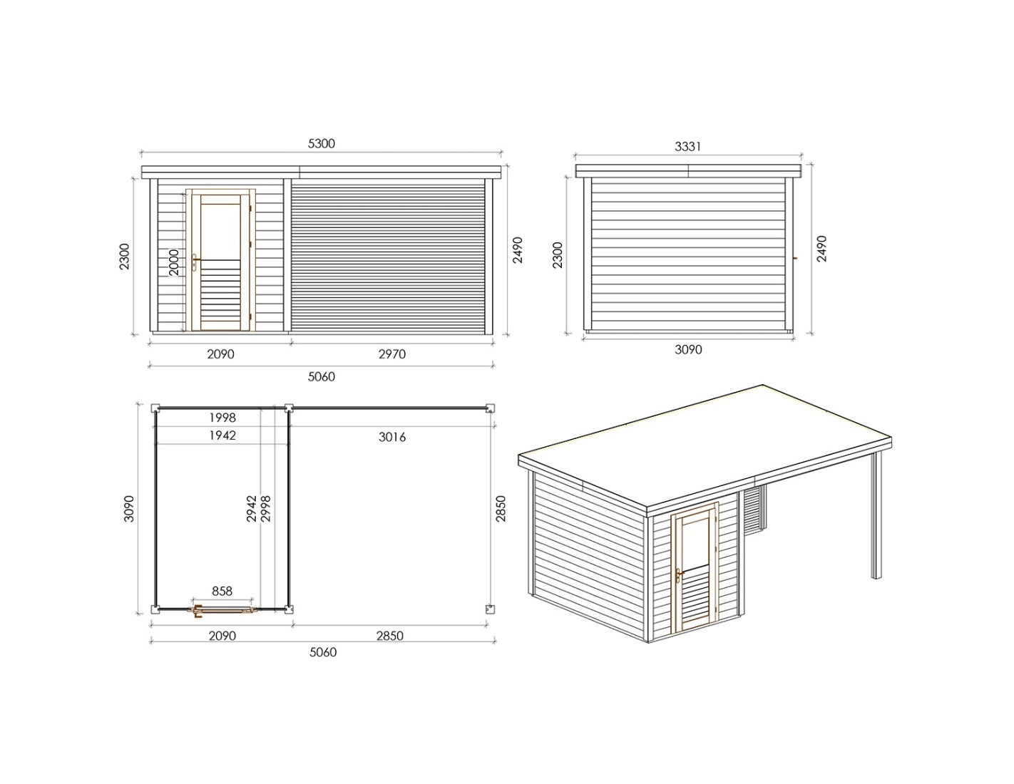 Caseta de madera para herramientas 000140 de superficie de 15.63 m2, ancho de 5.06 m, profundidad de 3.09 m y espesor de pared de 28 mm. La caseta es fácil de montar, las instrucciones de montaje están incluidas.