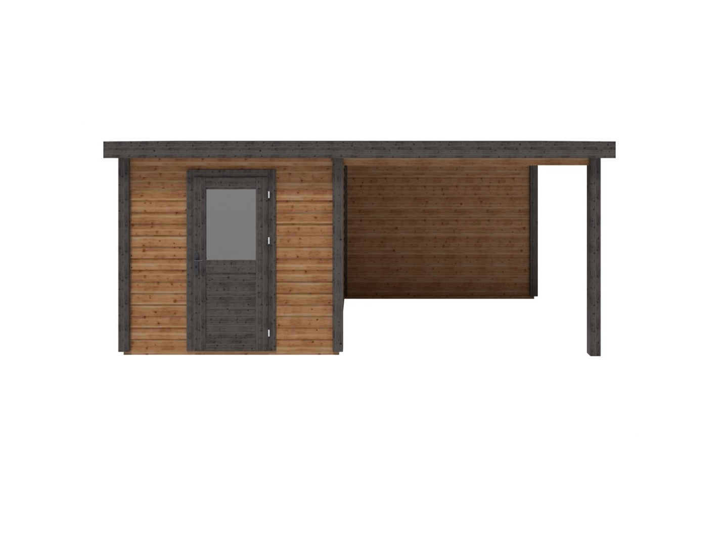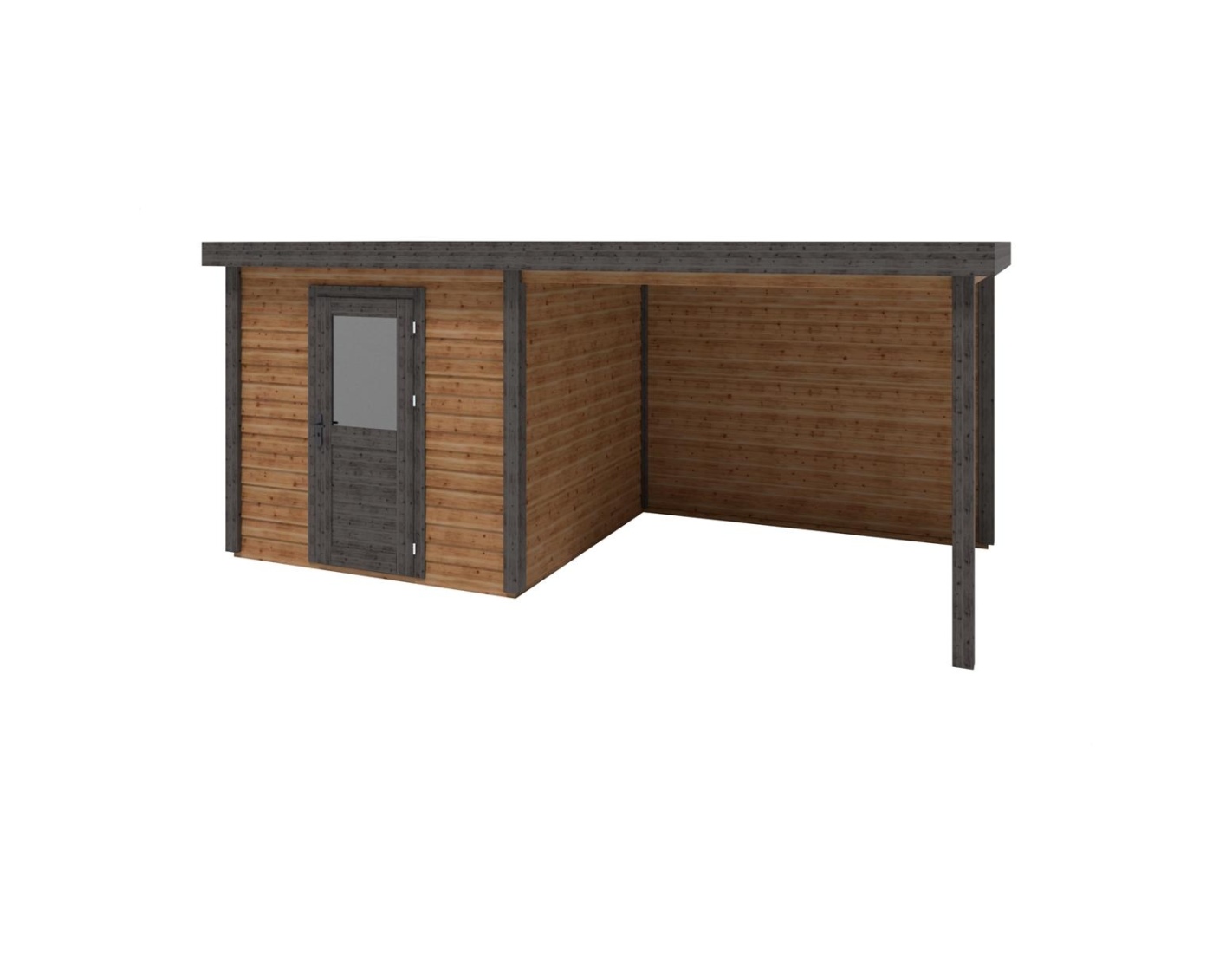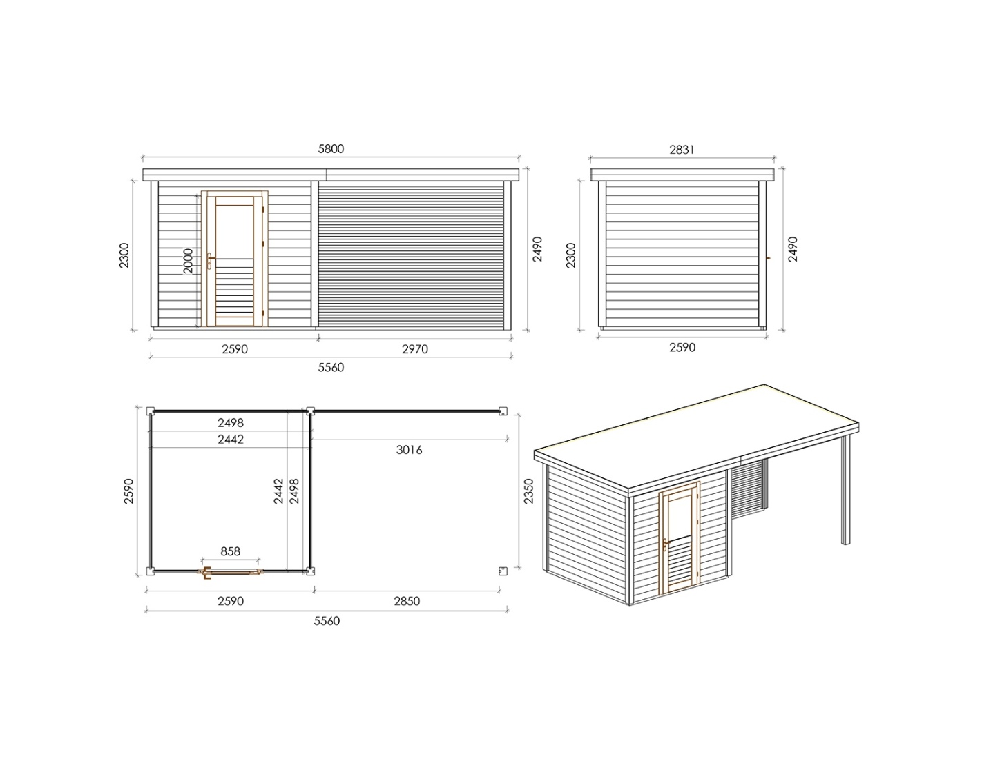 Caseta de madera para herramientas 000143 de superficie de 14.4 m2, ancho de 5.56 m, profundidad de 2.59 m y espesor de pared de 28 mm. La caseta es fácil de montar, las instrucciones de montaje están incluidas.