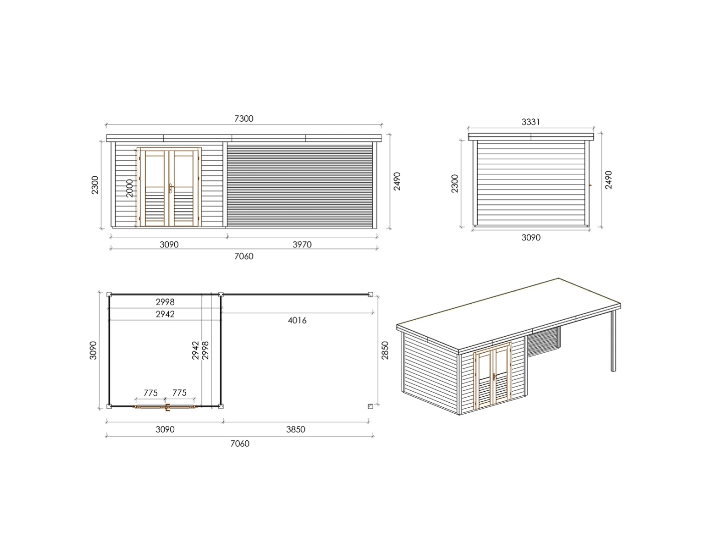 Caseta de madera para herramientas 000151 de superficie de 21.81 m2, ancho de 7.06 m, profundidad de 3.09 m y espesor de pared de 28 mm. La caseta es fácil de montar, las instrucciones de montaje están incluidas.