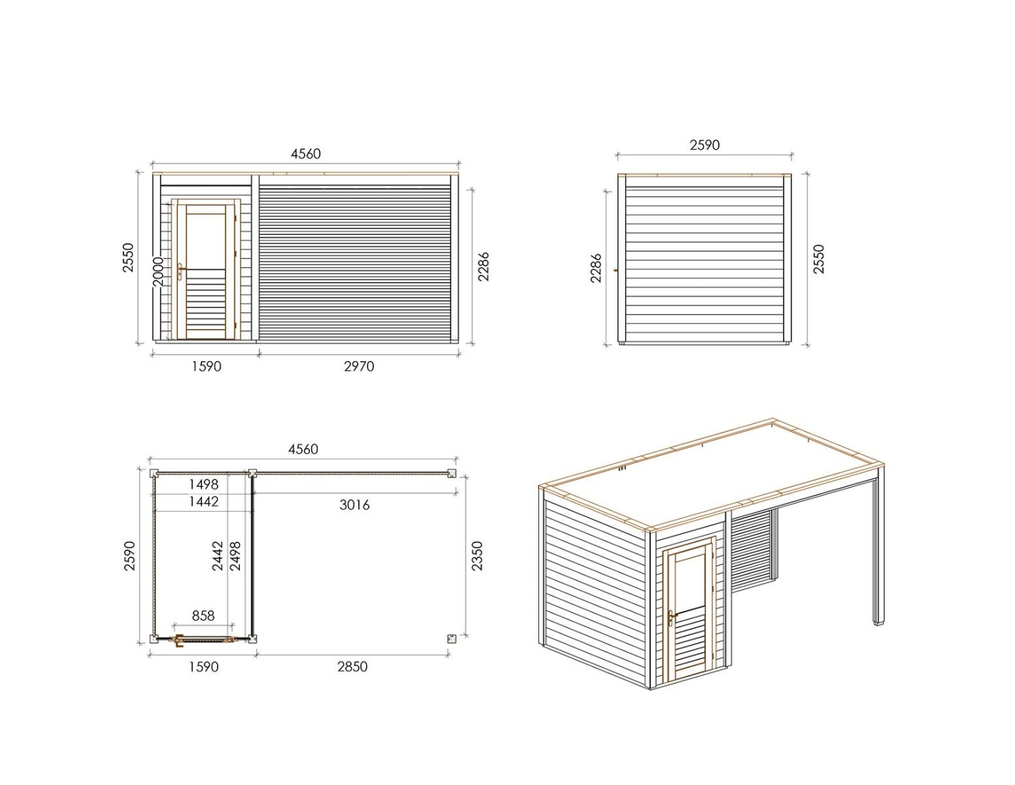 Caseta de madera para herramientas 000182 de superficie de 11.81 m2, ancho de 4.56 m, profundidad de 2.59 m y espesor de pared de 28 mm. La caseta es fácil de montar, las instrucciones de montaje están incluidas.