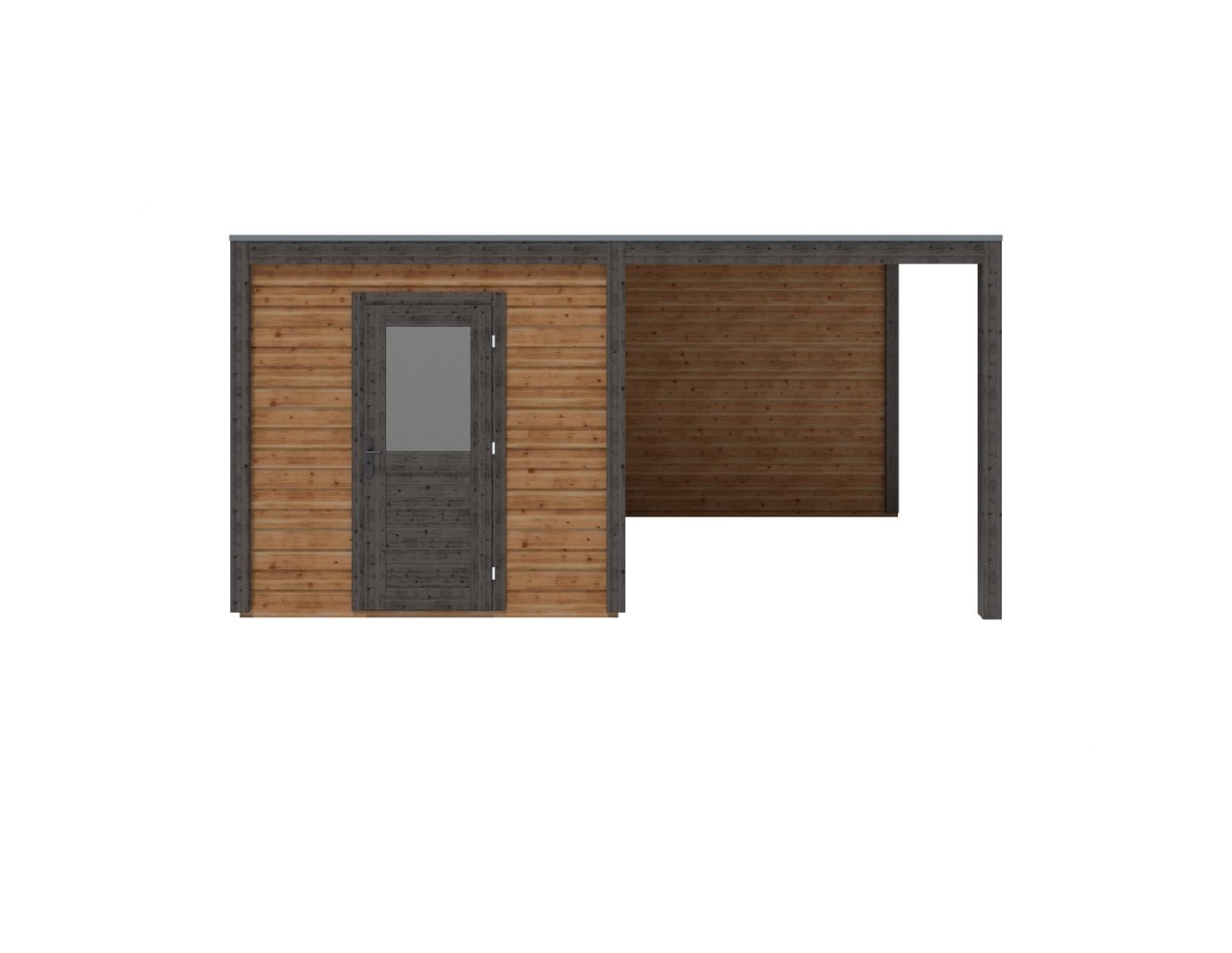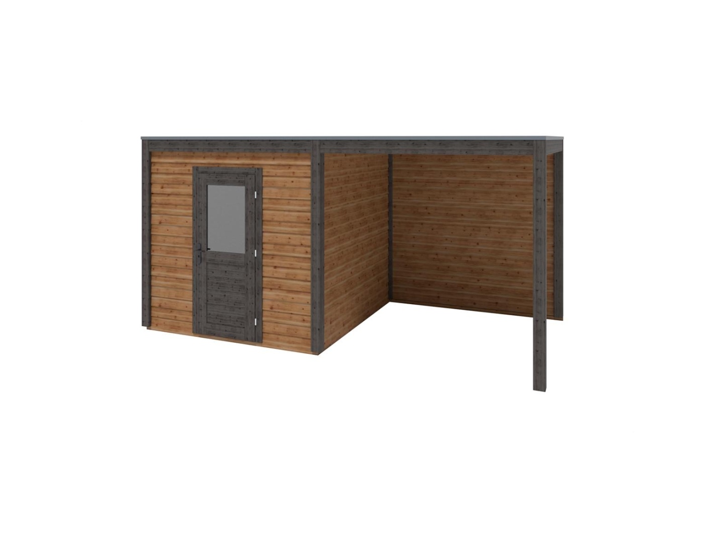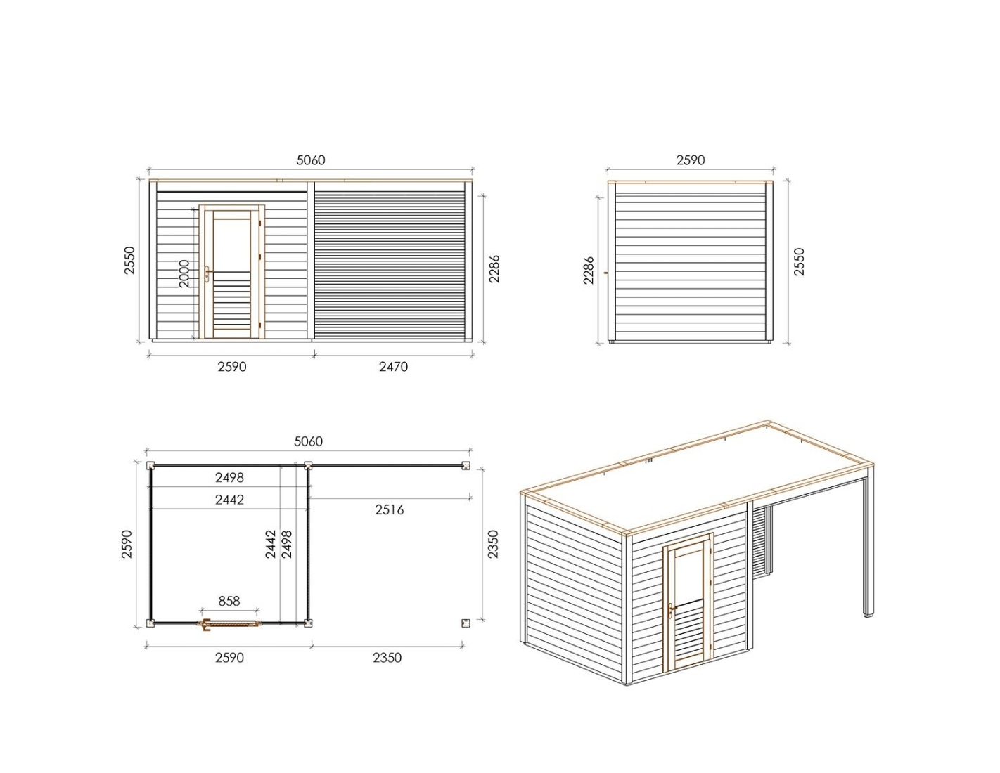 Caseta de madera para herramientas 000191 de superficie de 13.11 m2, ancho de 5.06 m, profundidad de 2.59 m y espesor de pared de 28 mm. La caseta es fácil de montar, las instrucciones de montaje están incluidas.