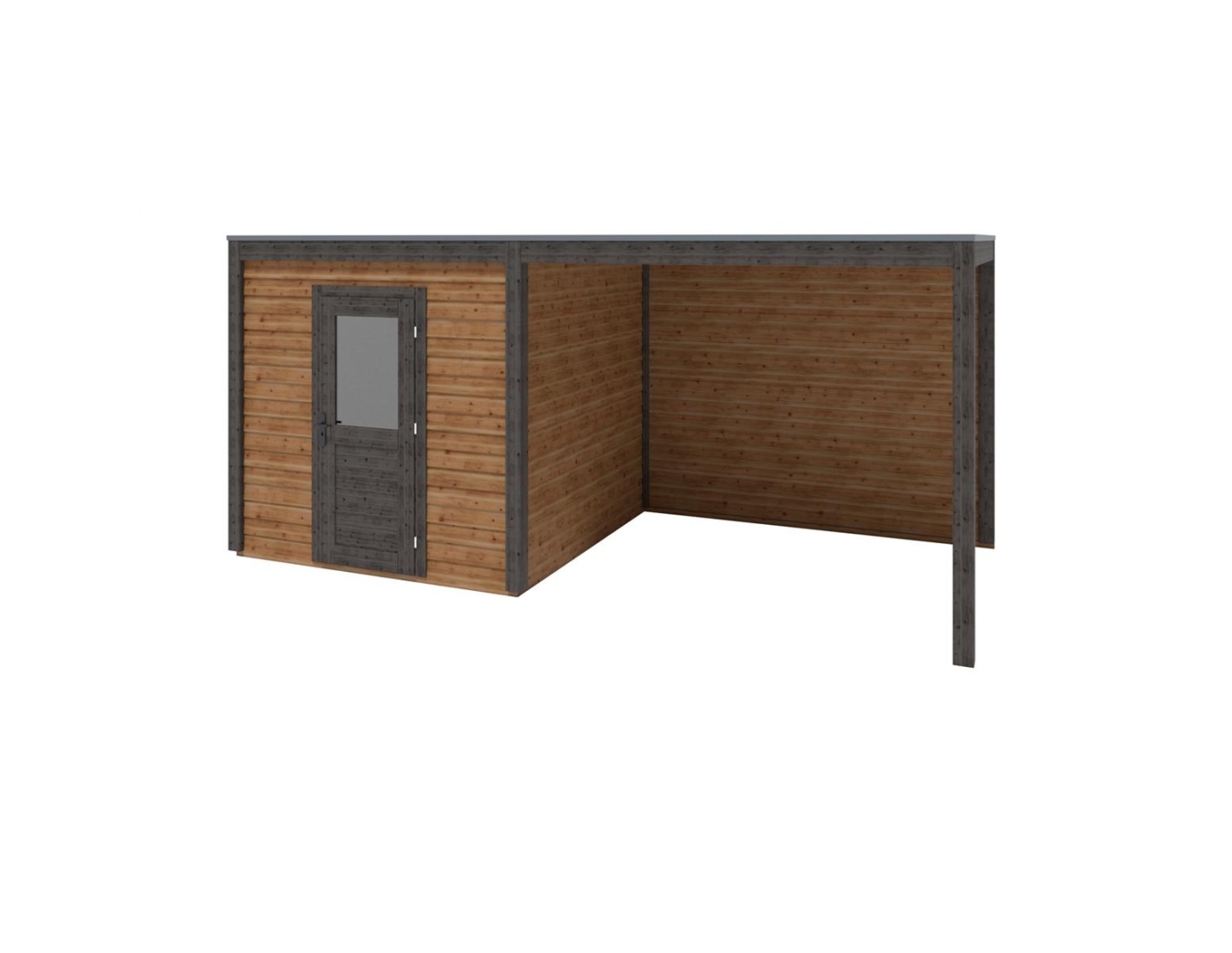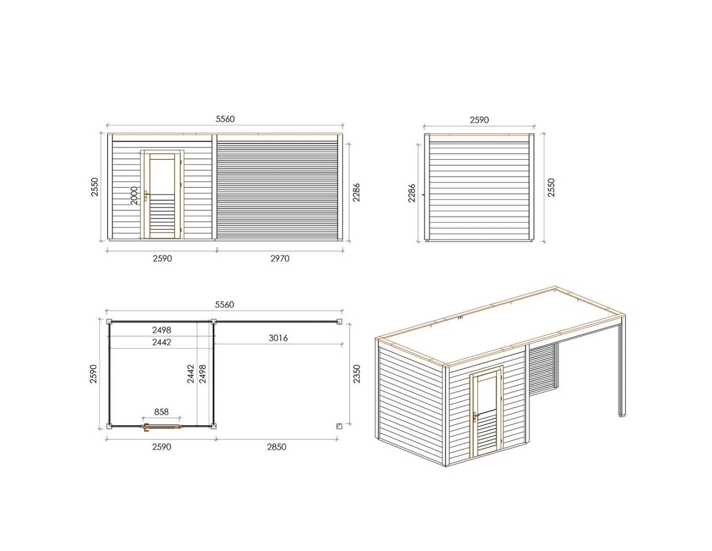 Caseta de madera para herramientas 000192 de superficie de 14.4 m2, ancho de 5.56 m, profundidad de 2.59 m y espesor de pared de 28 mm. La caseta es fácil de montar, las instrucciones de montaje están incluidas.