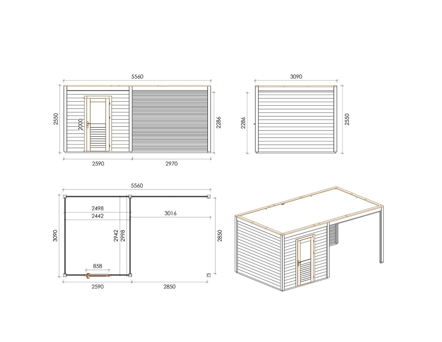 Caseta de madera para herramientas 000194 de superficie de 17.18 m2, ancho de 5.56 m, profundidad de 3.09 m y espesor de pared de 28 mm. La caseta es fácil de montar, las instrucciones de montaje están incluidas.
