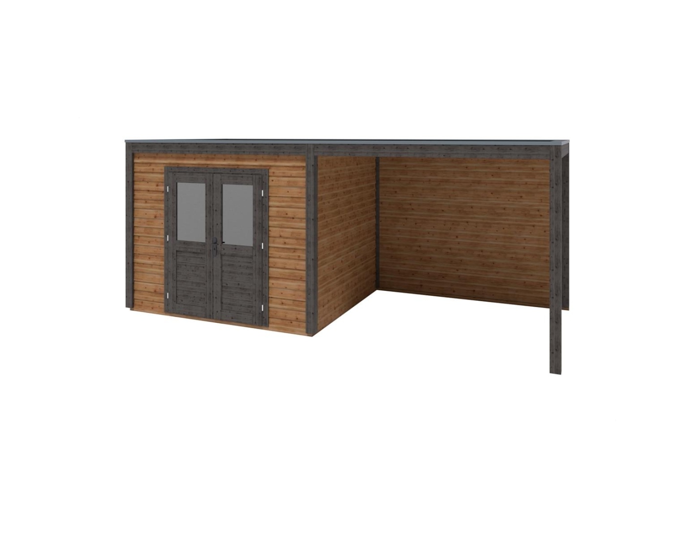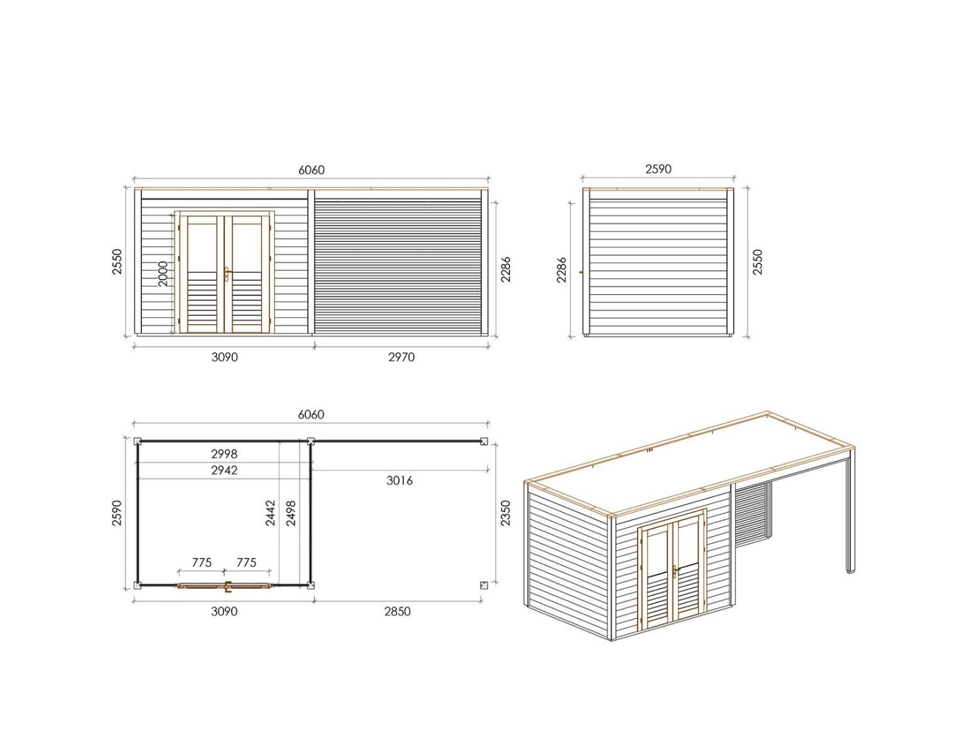 Caseta de madera para herramientas 000197 de superficie de 15.7 m2, ancho de 6.06 m, profundidad de 2.59 m y espesor de pared de 28 mm. La caseta es fácil de montar, las instrucciones de montaje están incluidas.