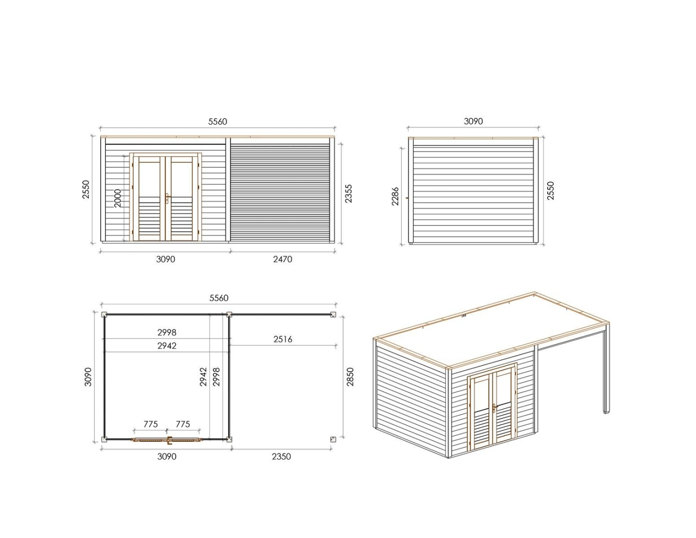 Caseta de madera para herramientas 000198 de superficie de 17.18 m2, ancho de 5.56 m, profundidad de 3.09 m y espesor de pared de 28 mm. La caseta es fácil de montar, las instrucciones de montaje están incluidas.