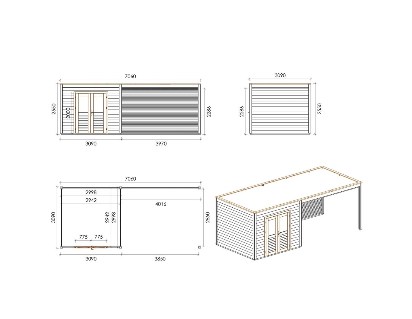 Caseta de jardín de madera Sora 7.06x3.09 m - 21.82 m2 - 28 mm – impregnada
