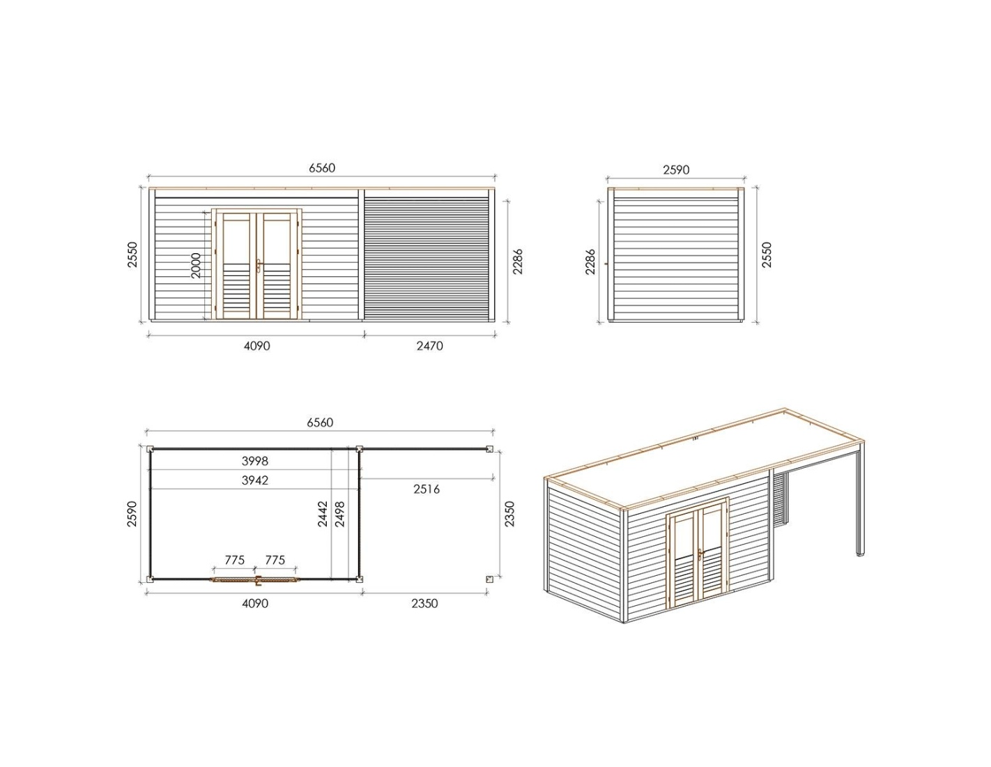 Caseta de madera para herramientas 000201 de superficie de 16.99 m2, ancho de 6.56 m, profundidad de 2.59 m y espesor de pared de 28 mm. La caseta es fácil de montar, las instrucciones de montaje están incluidas.