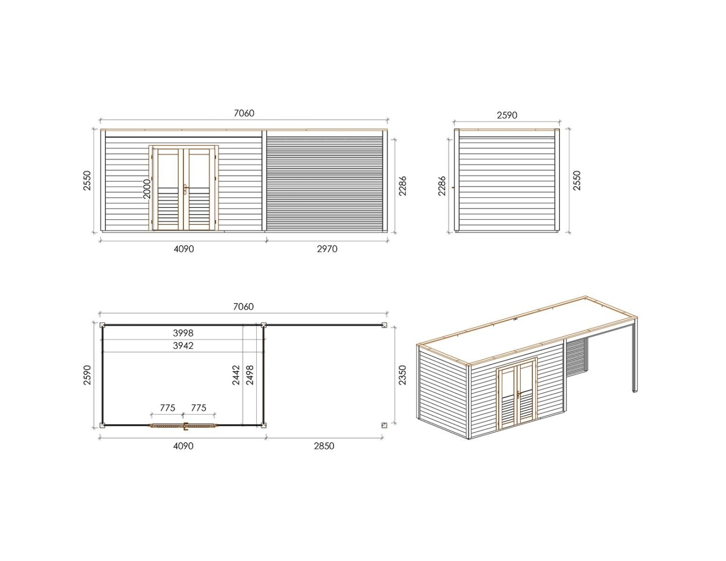 Caseta de madera para herramientas 000202 de superficie de 18.29 m2, ancho de 7.06 m, profundidad de 2.59 m y espesor de pared de 28 mm. La caseta es fácil de montar, las instrucciones de montaje están incluidas.