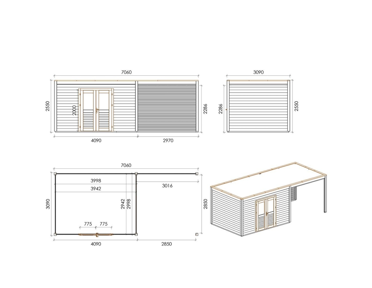 Caseta de madera para herramientas 000204 de superficie de 21.82 m2, ancho de 7.06 m, profundidad de 3.09 m y espesor de pared de 28 mm. La caseta es fácil de montar, las instrucciones de montaje están incluidas.