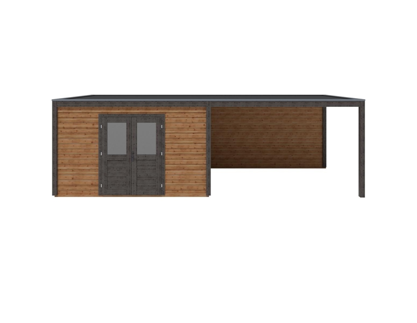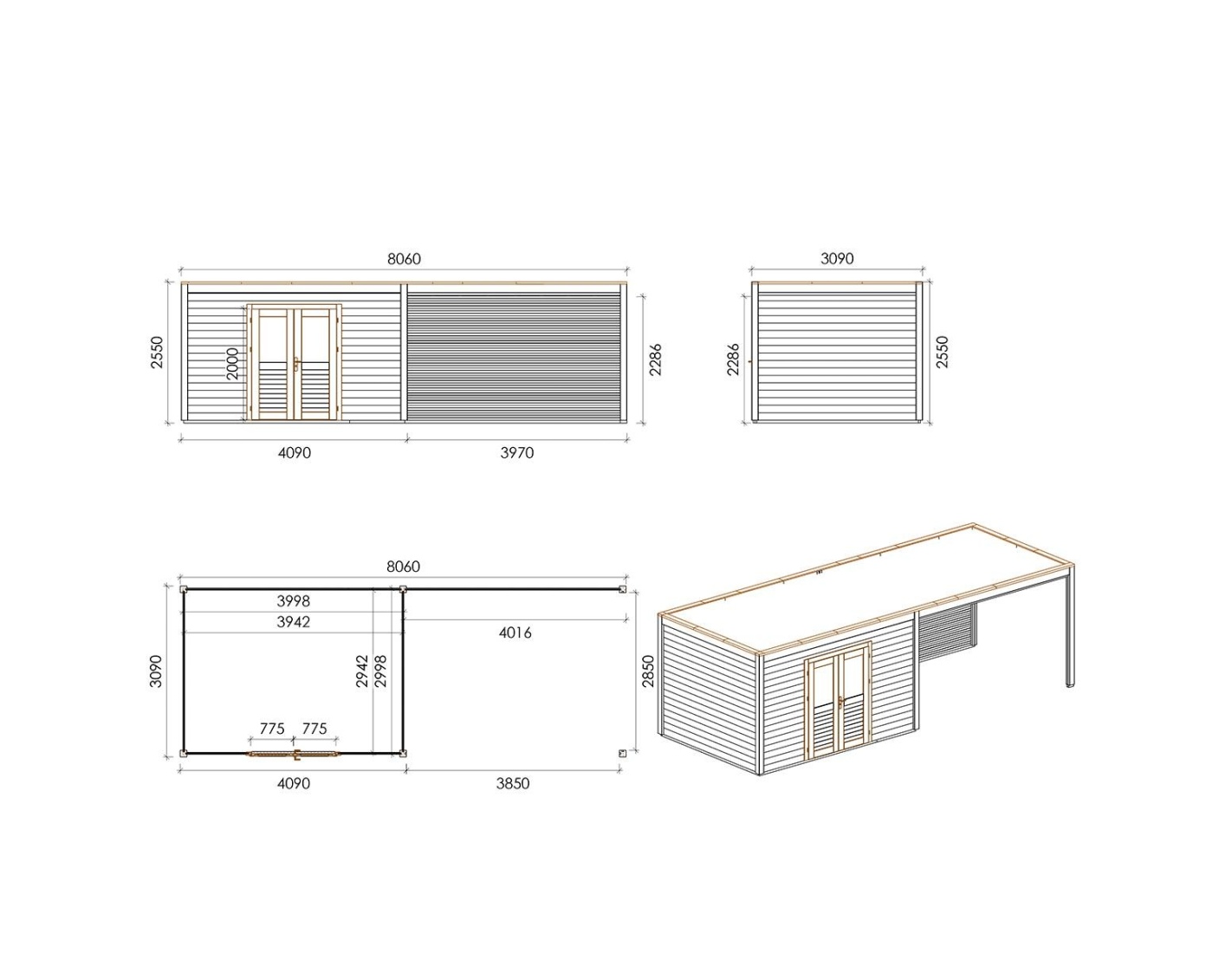 Caseta de madera para herramientas 000205 de superficie de 24.91 m2, ancho de 8.06 m, profundidad de 3.09 m y espesor de pared de 28 mm. La caseta es fácil de montar, las instrucciones de montaje están incluidas.