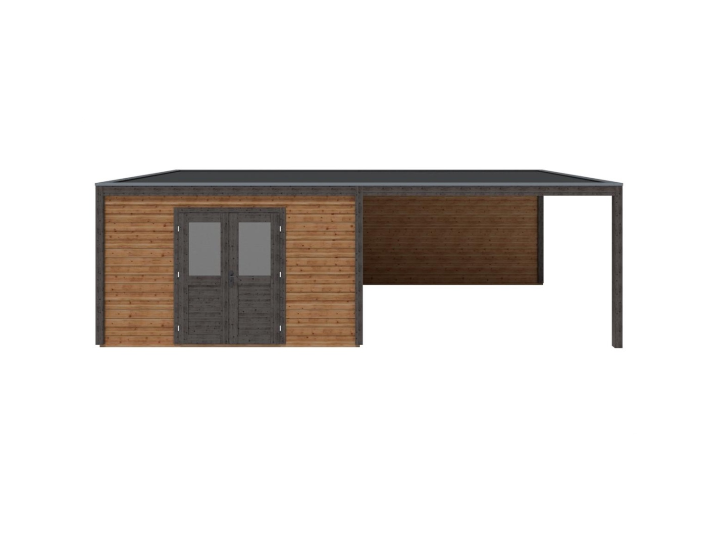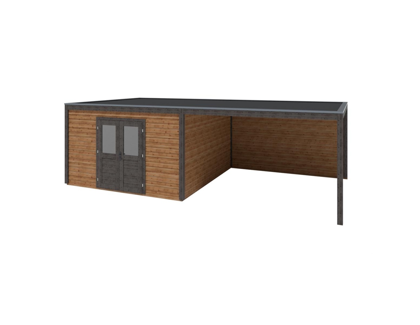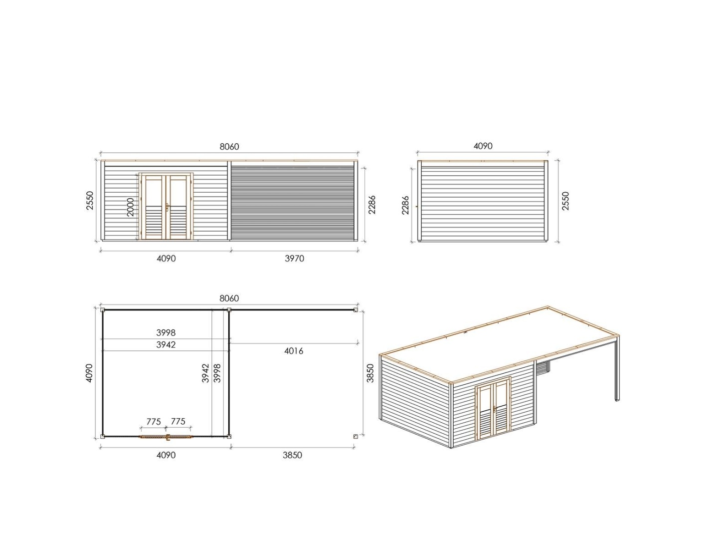 Caseta de madera para herramientas 000206 de superficie de 32.96 m2, ancho de 8.06 m, profundidad de 4.09 m y espesor de pared de 28 mm. La caseta es fácil de montar, las instrucciones de montaje están incluidas.