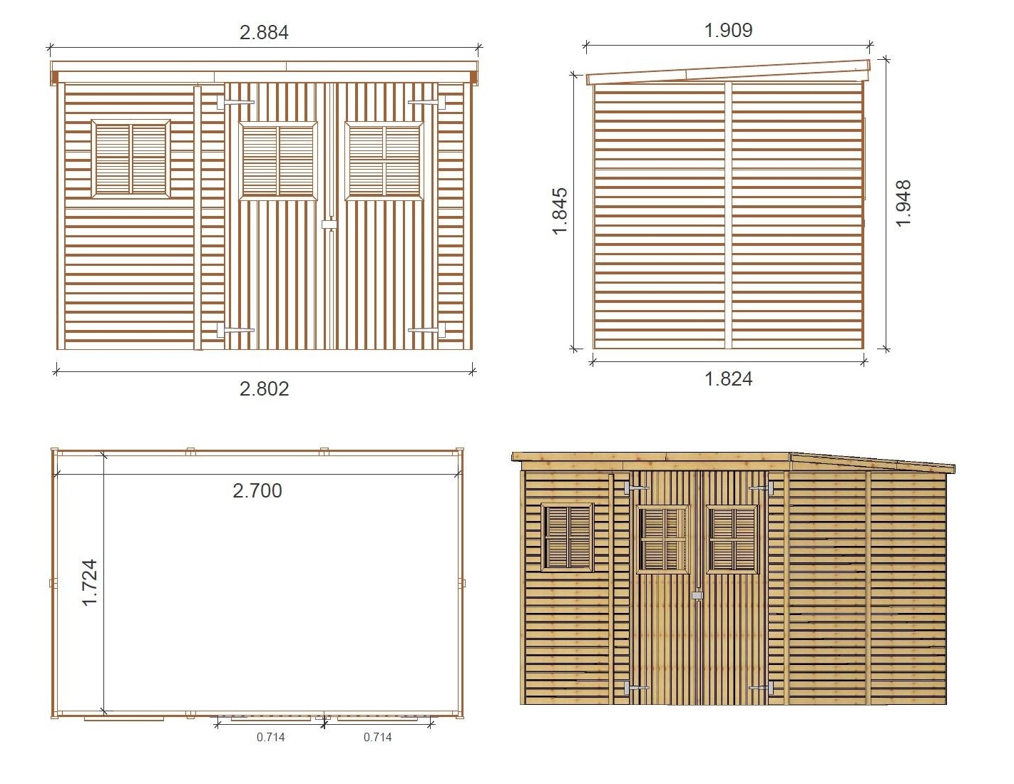 Caseta de madera para herramientas DOM421 de superficie 4.86 m2, ancho frontal de 2.7 m, profundidad 1.8 m y espesor de pared de 12.5 mm. El montaje de la caseta, gracias a las instrucciones adjuntas al producto, no causa mayores problemas.