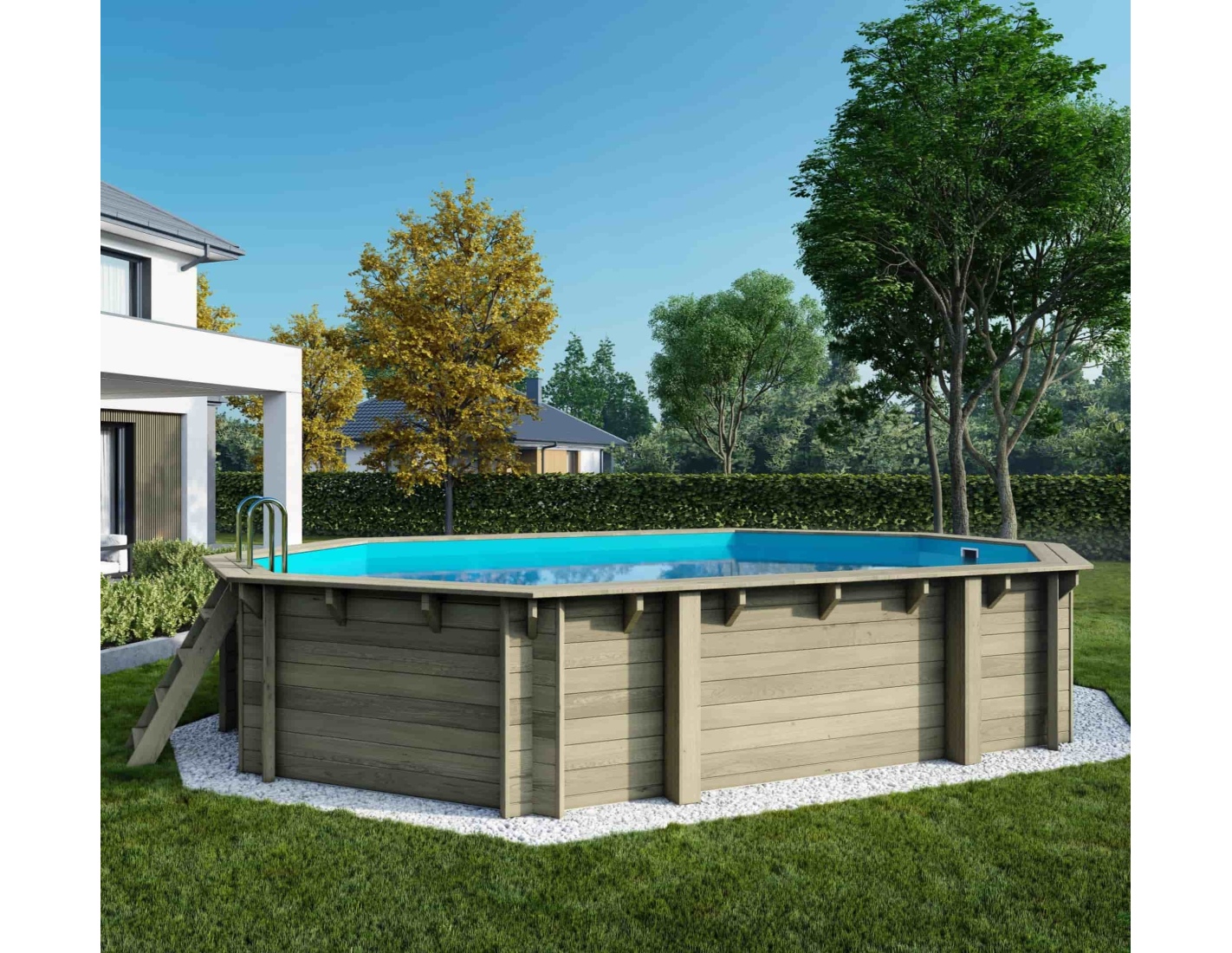 La madera aporta al entorno un carácter elegante y acogedor, y su aspecto clásico permite que la piscina se integre en cualquier tipo de jardín. Puedes añadir terrazas de madera, plantas o iluminación decorativa para crear un espacio verdaderamente acogedor.
