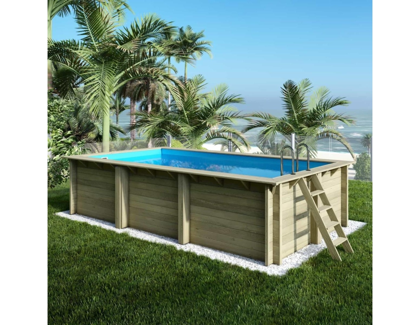 Piscina de madera AQUA 6.1 x 2.85 – H.1.31 m, azul claro, con vigas a encastrar en la solera