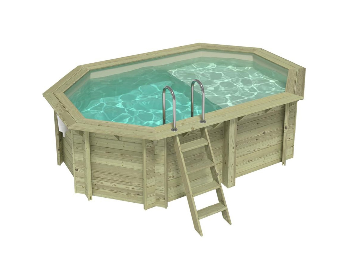 Descubre una piscina que combina la belleza natural de la madera, la estabilidad de la estructura y una solución única de zona de relax poco profunda.