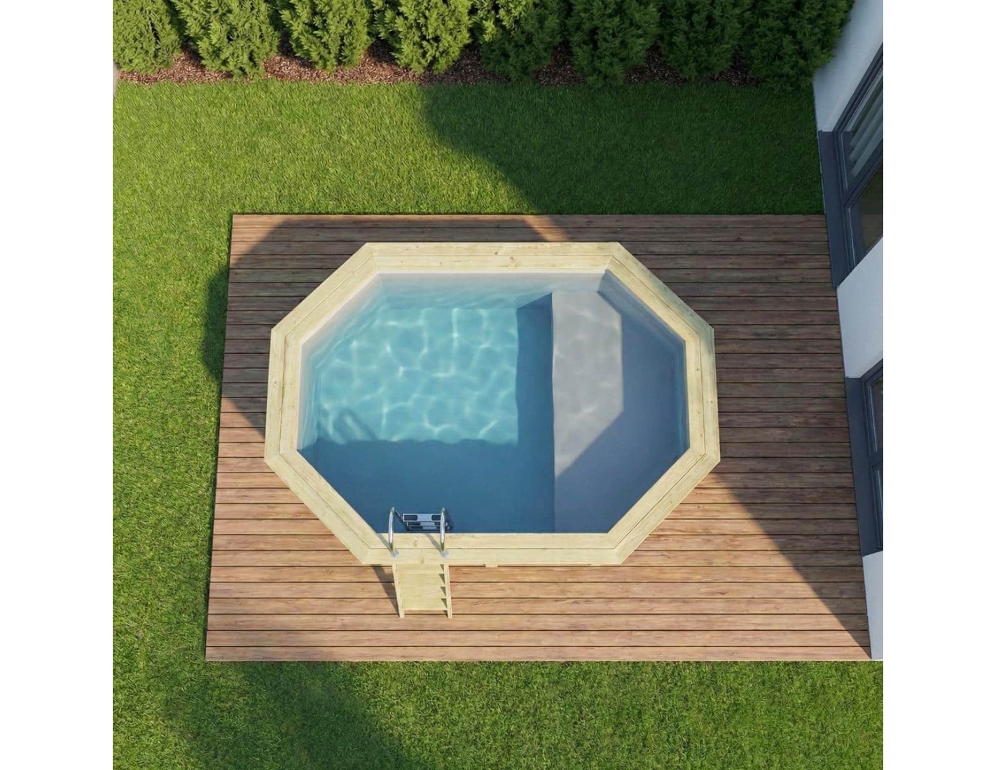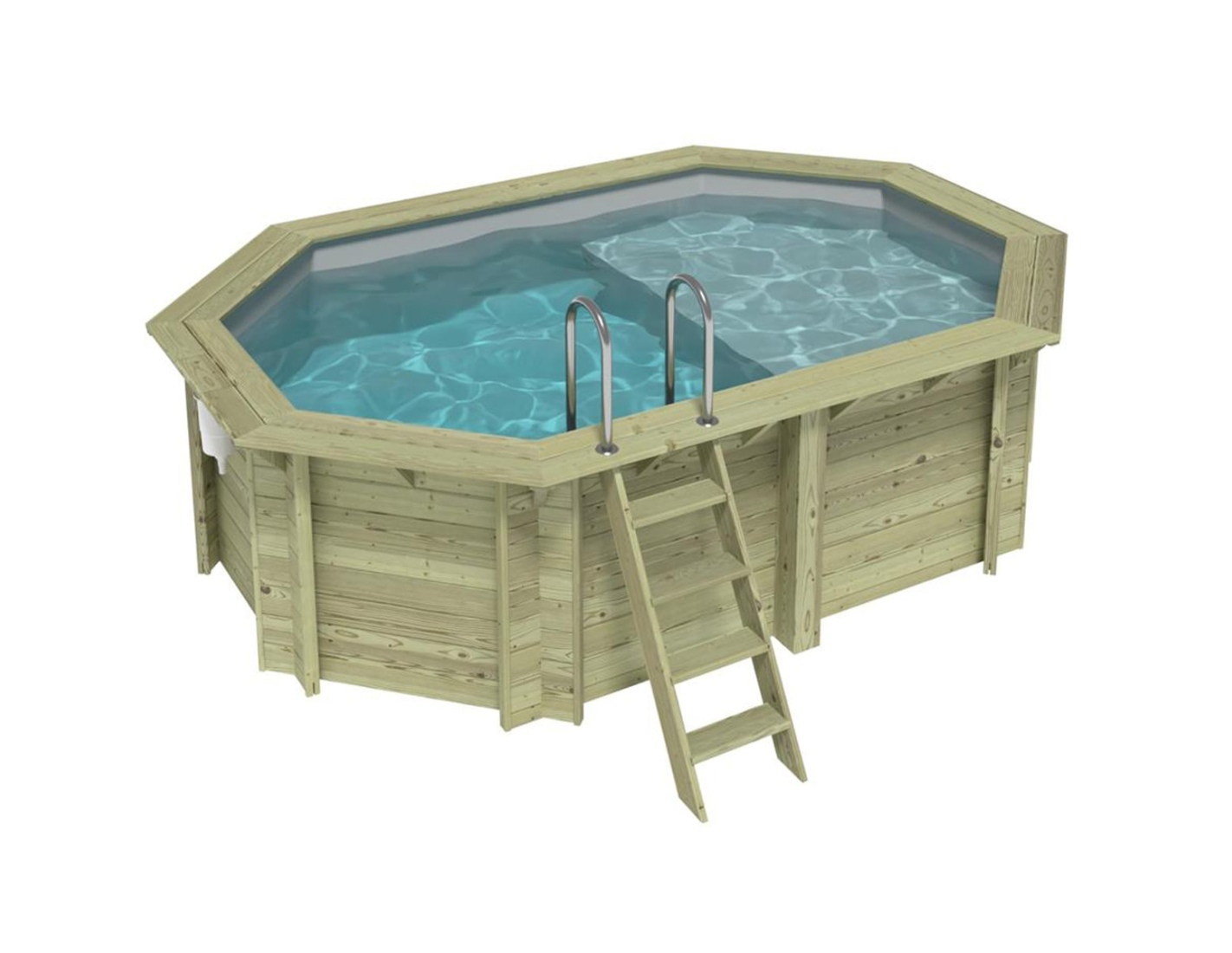 Descubre una piscina que combina la belleza natural de la madera, la estabilidad de la estructura y una solución única de zona de relax poco profunda.