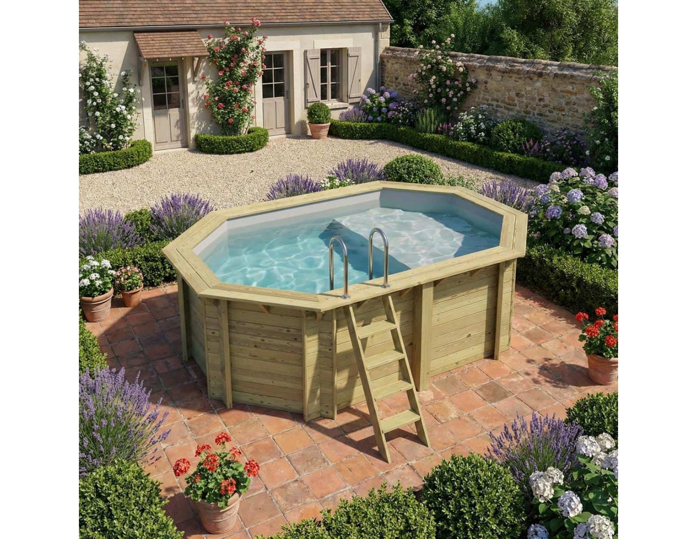 La madera aporta al entorno un carácter elegante y acogedor, y su aspecto clásico permite que la piscina se integre en cualquier tipo de jardín. Puedes añadir terrazas de madera, plantas o iluminación decorativa para crear un espacio verdaderamente acogedor.