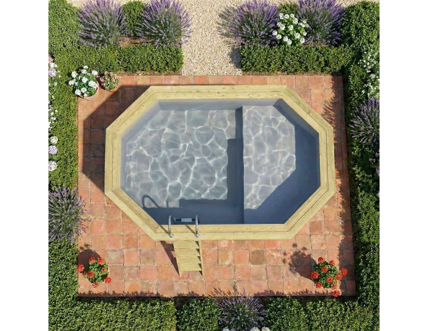 Descubre una piscina que combina la belleza natural de la madera, la estabilidad de la estructura y una solución única de zona de relax poco profunda.