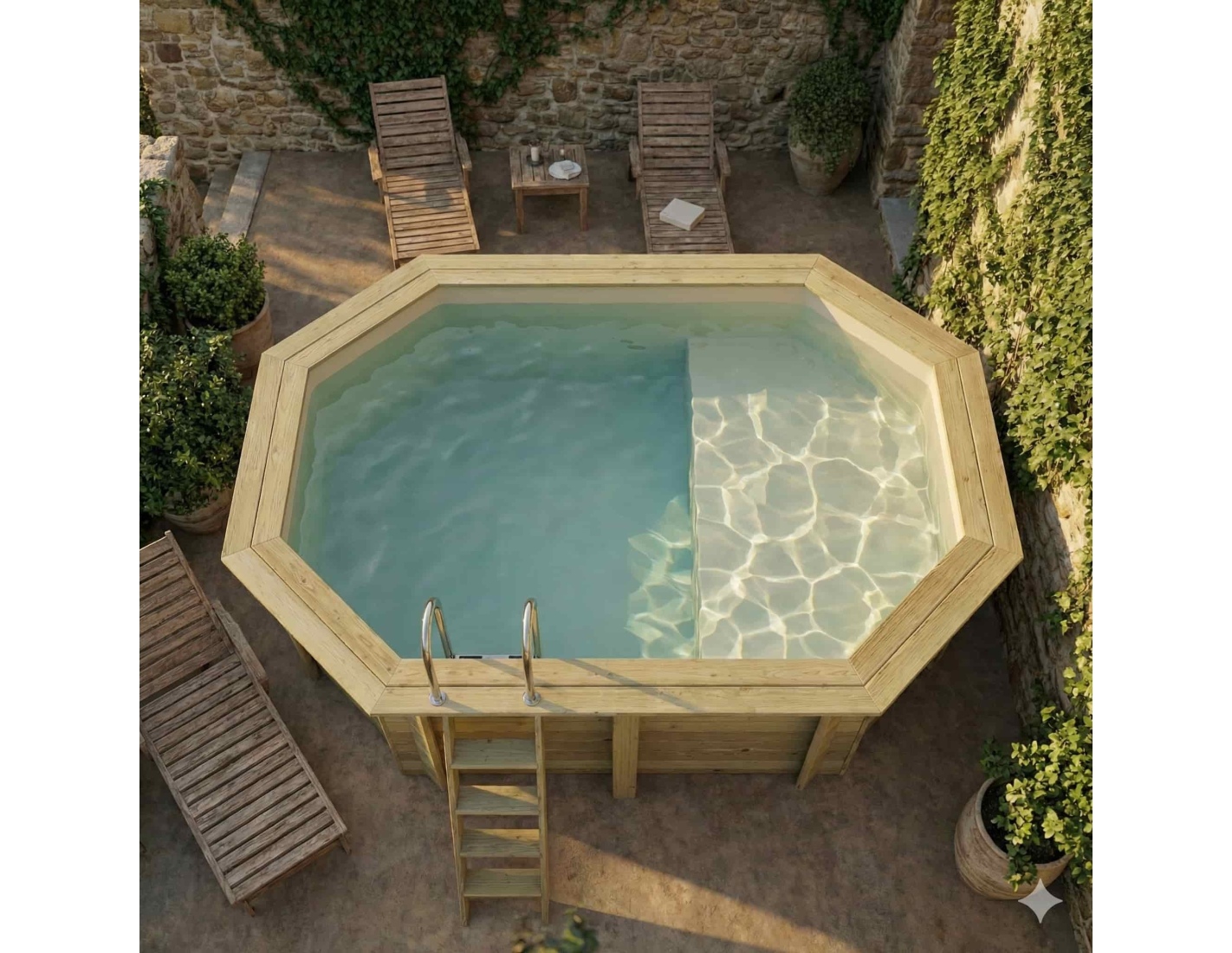 Piscina de madera 7.2 m³ con zona de relax, ideal para niños y adultos.