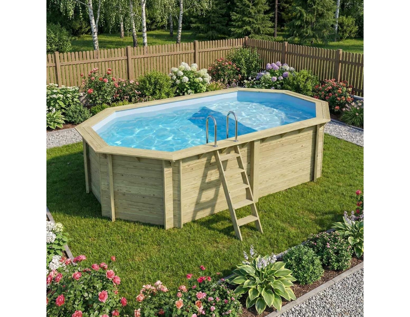 La madera aporta al entorno un carácter elegante y acogedor, y su aspecto clásico permite que la piscina se integre en cualquier tipo de jardín. Puedes añadir terrazas de madera, plantas o iluminación decorativa para crear un espacio verdaderamente acogedor.