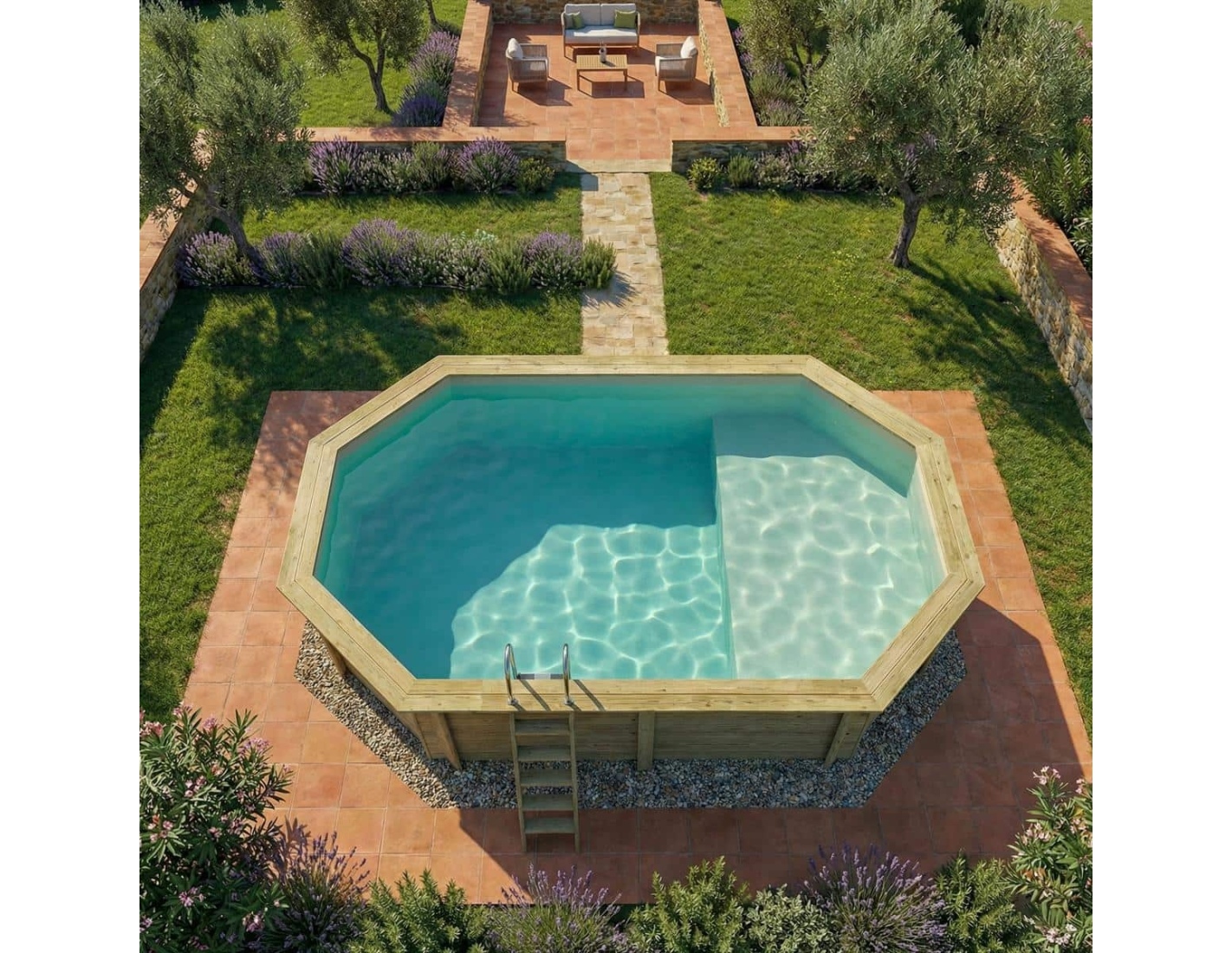 El modelo de piscina con dimensiones 5.79 × 3.49 m y una altura de 1.45 m ofrece dos niveles de profundidad – diseñado para quienes buscan algo más que una piscina de jardín convencional.