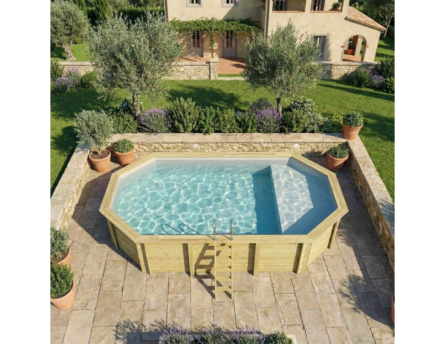 Descubre una piscina que combina la belleza natural de la madera, la estabilidad de la estructura y una solución única de zona de relax poco profunda.