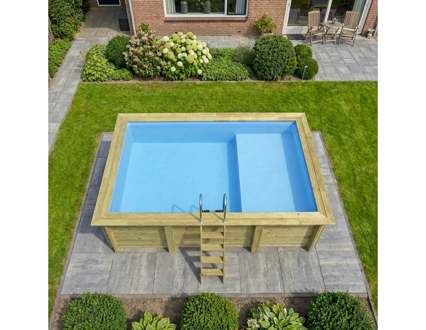 Descubre una piscina que combina la belleza natural de la madera, la estabilidad de la estructura y una solución única de zona de relax poco profunda.
