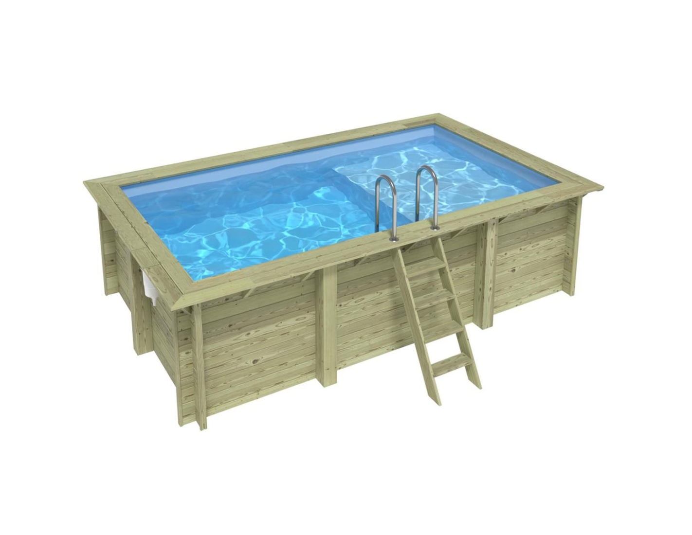 Descubre una piscina que combina la belleza natural de la madera, la estabilidad de la estructura y una solución única de zona de relax poco profunda.