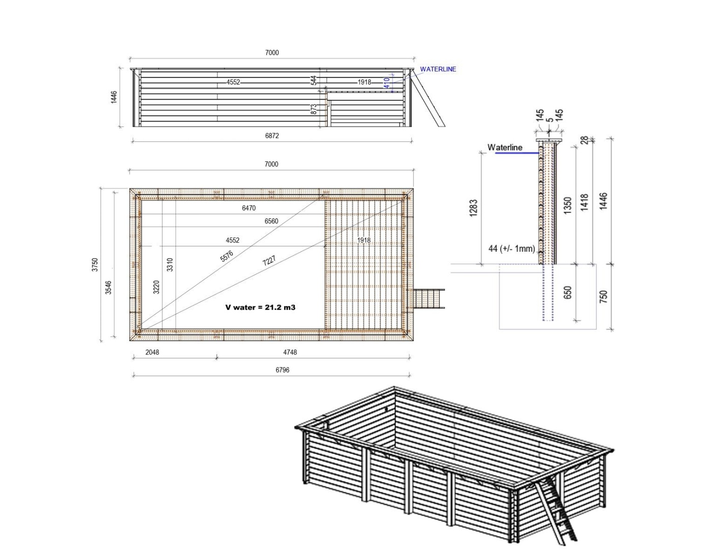 El modelo de piscina con dimensiones 7 × 3.75 m y una altura de 1.45 m ofrece dos niveles de profundidad – diseñado para quienes buscan algo más que una piscina de jardín convencional.