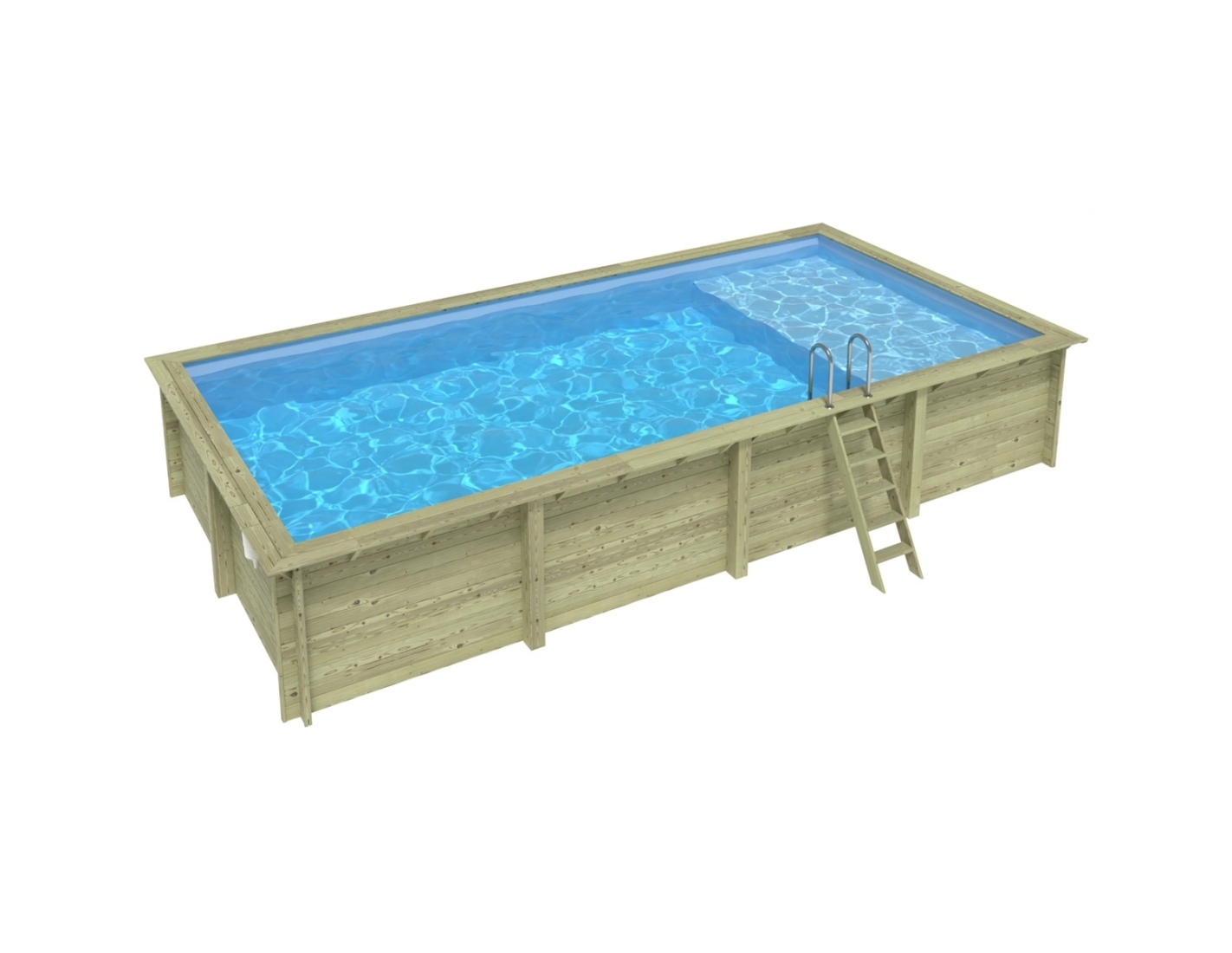 Descubre una piscina que combina la belleza natural de la madera, la estabilidad de la estructura y una solución única de zona de relax poco profunda.