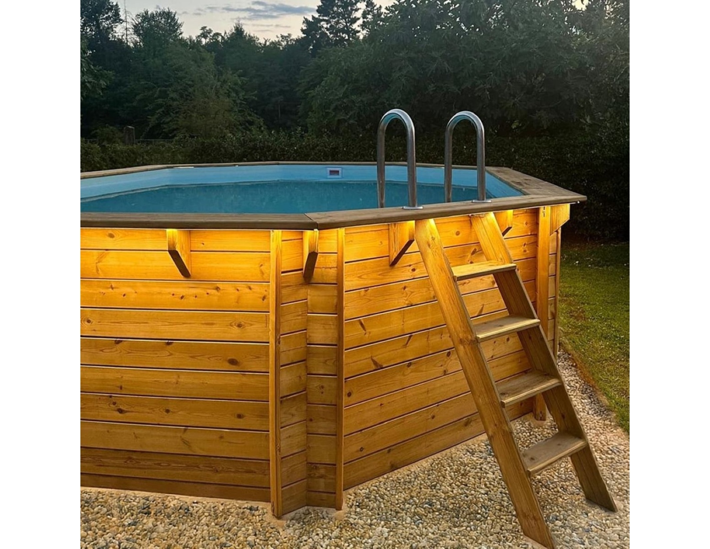La madera aporta al entorno un carácter elegante y acogedor, y su aspecto clásico permite que la piscina se integre en cualquier tipo de jardín. Puedes añadir terrazas de madera, plantas o iluminación decorativa para crear un espacio verdaderamente acogedor.