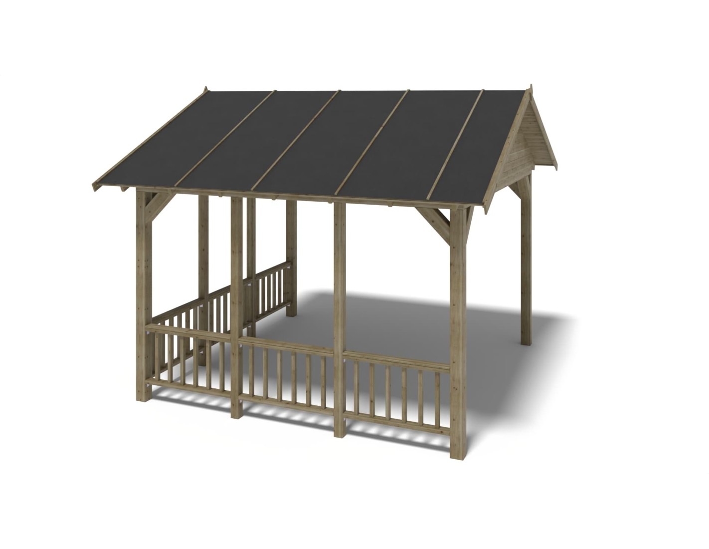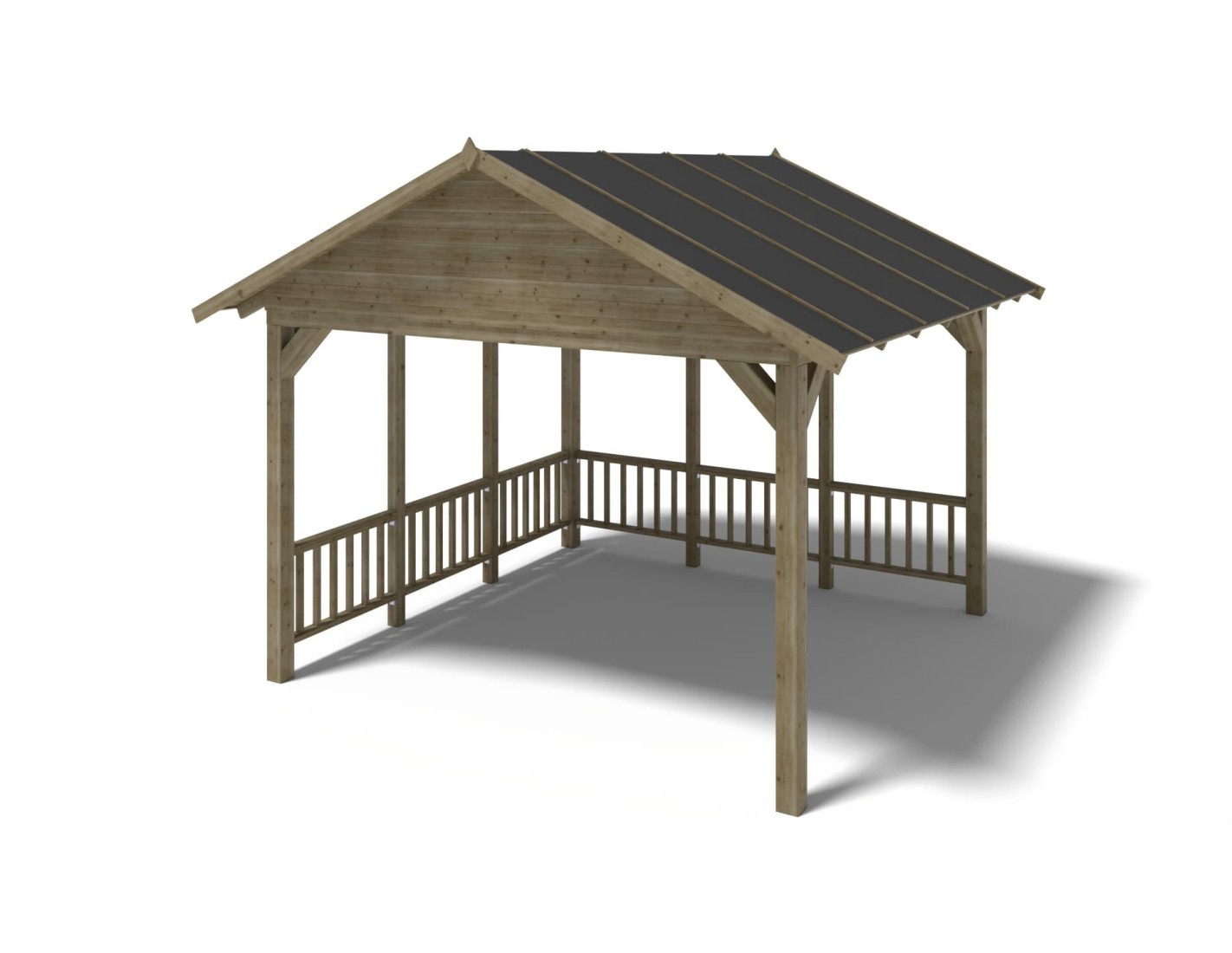 Pérgola de jardín de superficie de 16.3 m2, con postes estables de 120x120 mm, de madera seca de abeto, impregnada en color verde.