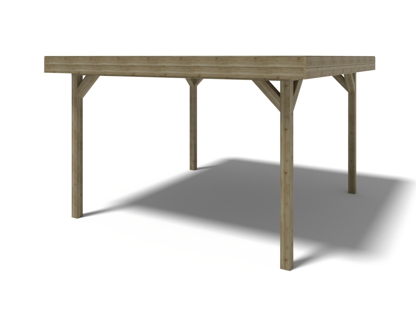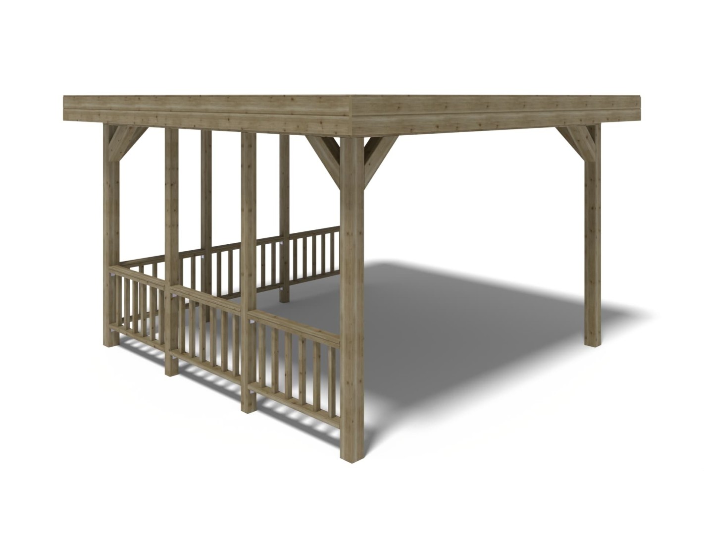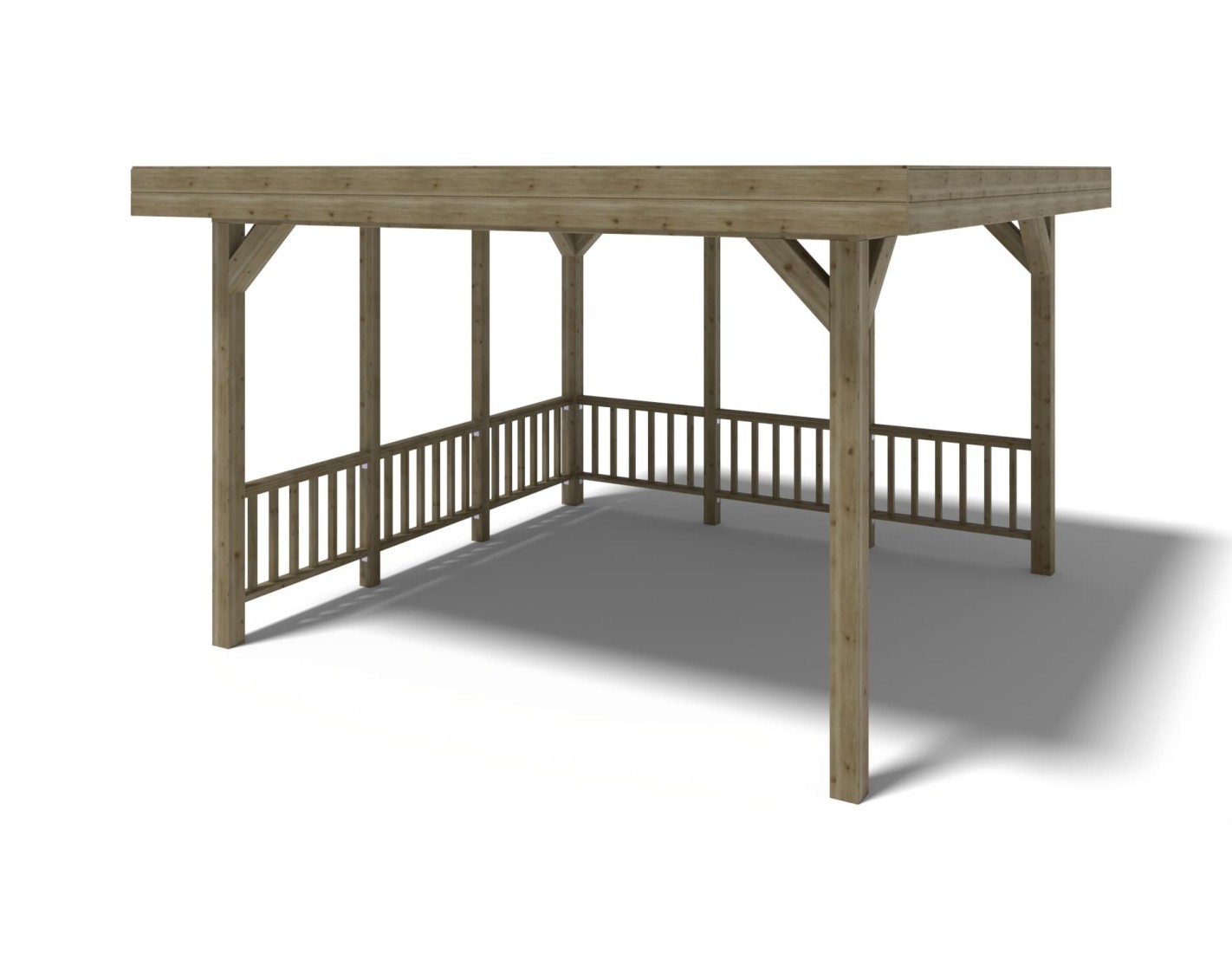 Pérgola de jardín de superficie de 16.3 m2, con postes estables de 120x120 mm, de madera seca de abeto, impregnada en color verde.