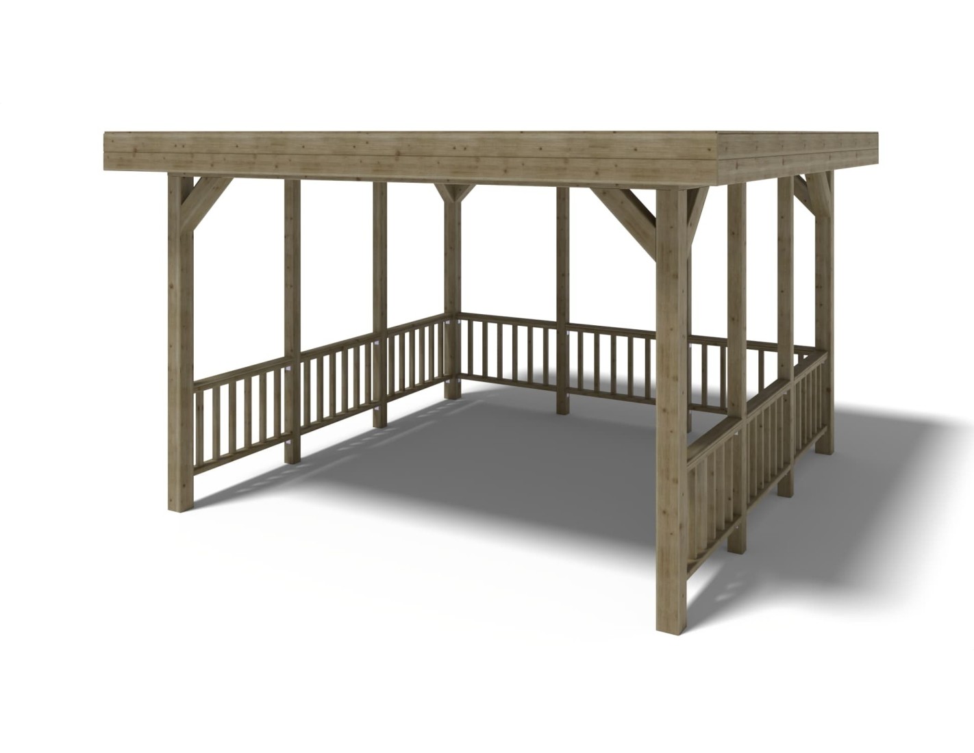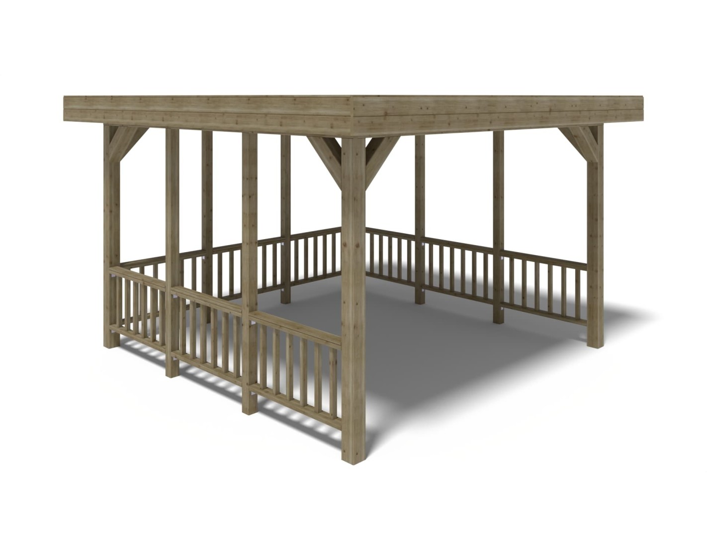 Pérgola de jardín de superficie de 16.3 m2, con postes estables de 120x120 mm, de madera seca de abeto, impregnada en color verde.