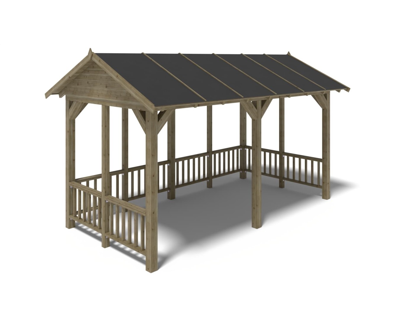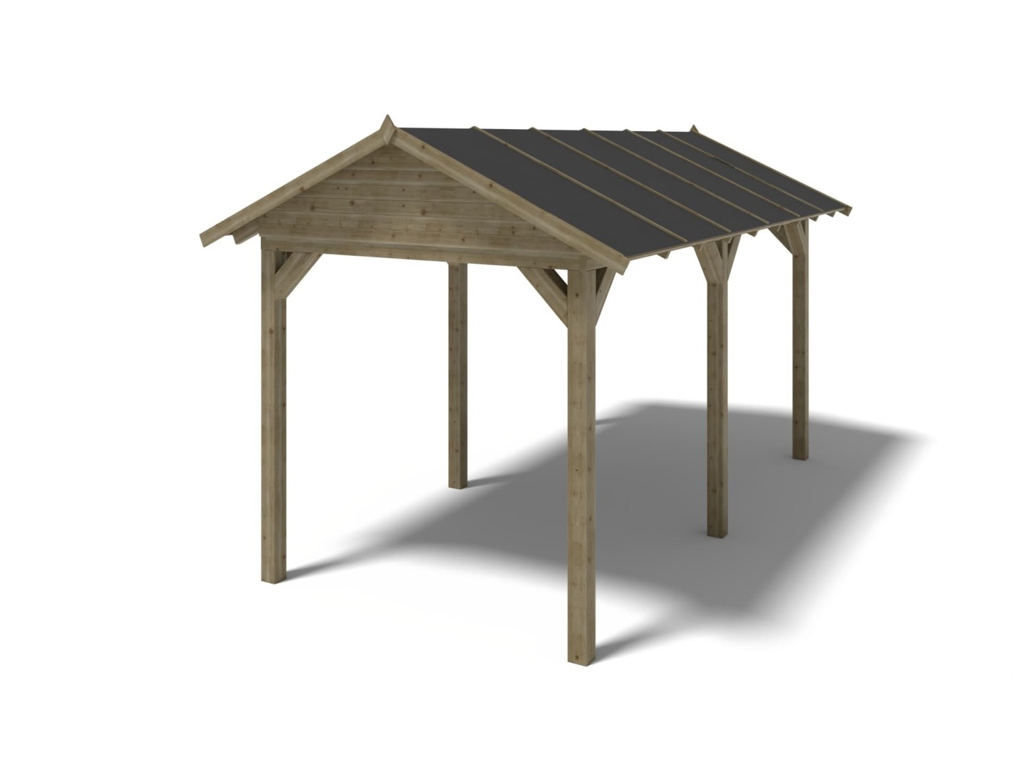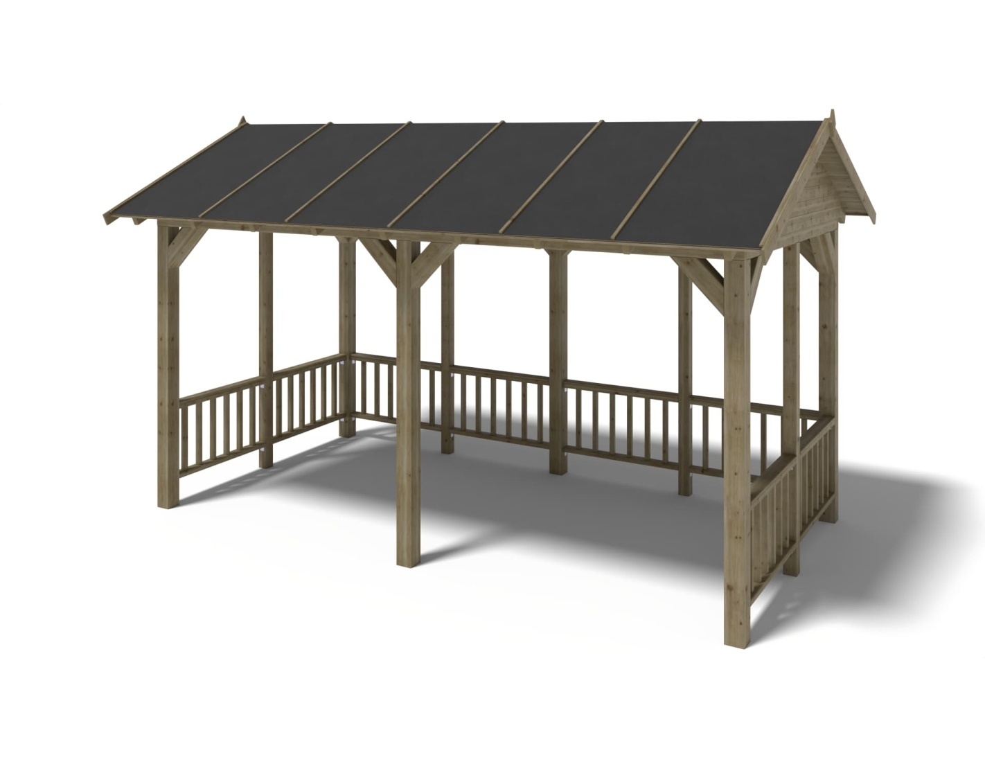 Pérgola de jardín de superficie de 15 m2, con postes estables de 120x120 mm, de madera seca de abeto, impregnada en color verde.