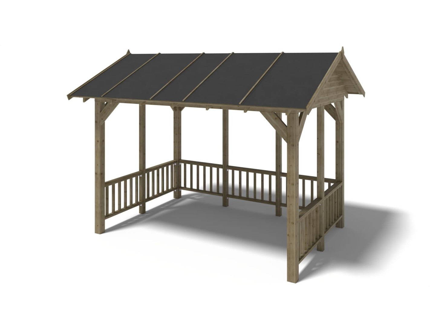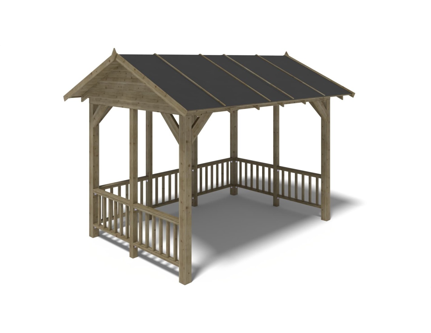Pérgola de jardín de superficie de 12 m2, con postes estables de 120x120 mm, de madera seca de abeto, impregnada en color verde.