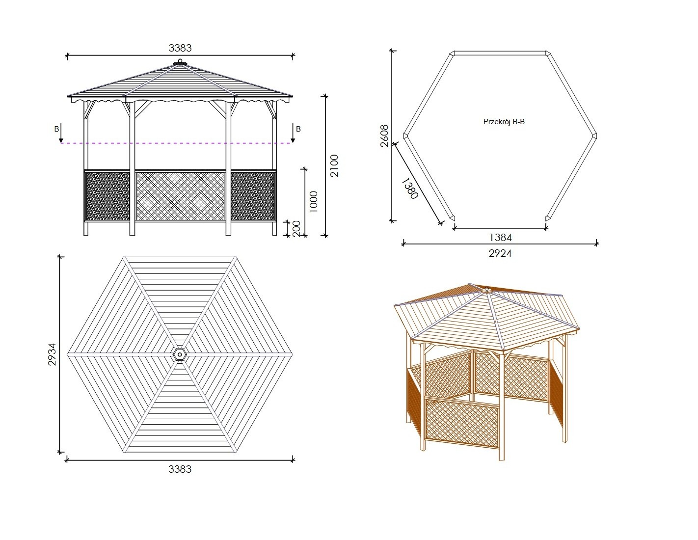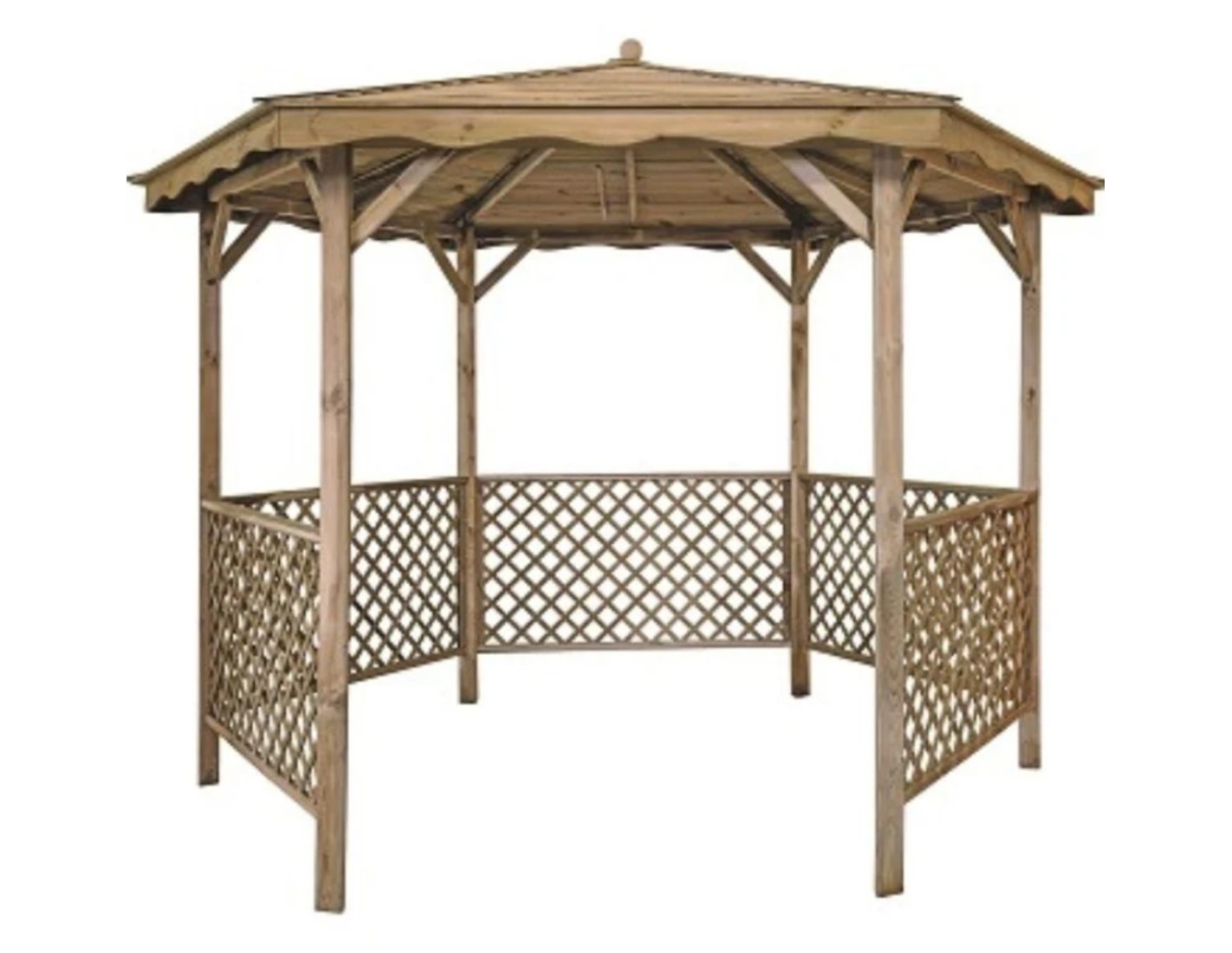Pérgola, cenador de jardín con paneles decorativos, superficie de 5.62 m², vigas de 60x90 mm, fabricado en madera de pino, secada y tratada a presión, color verde. El modelo ALT140 es un cenador moderno y elegante, diseñado para disfrutar al aire libre. Perfecto para jardines o terrenos de recreo, ofrece sombra y un espacio agradable en días cálidos.