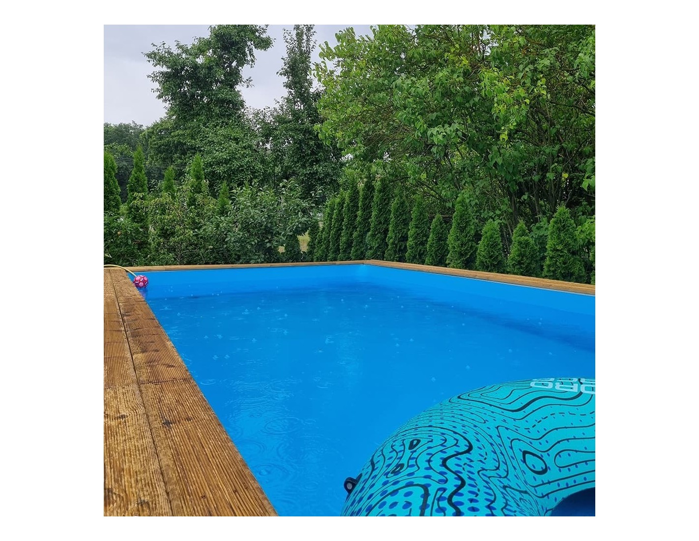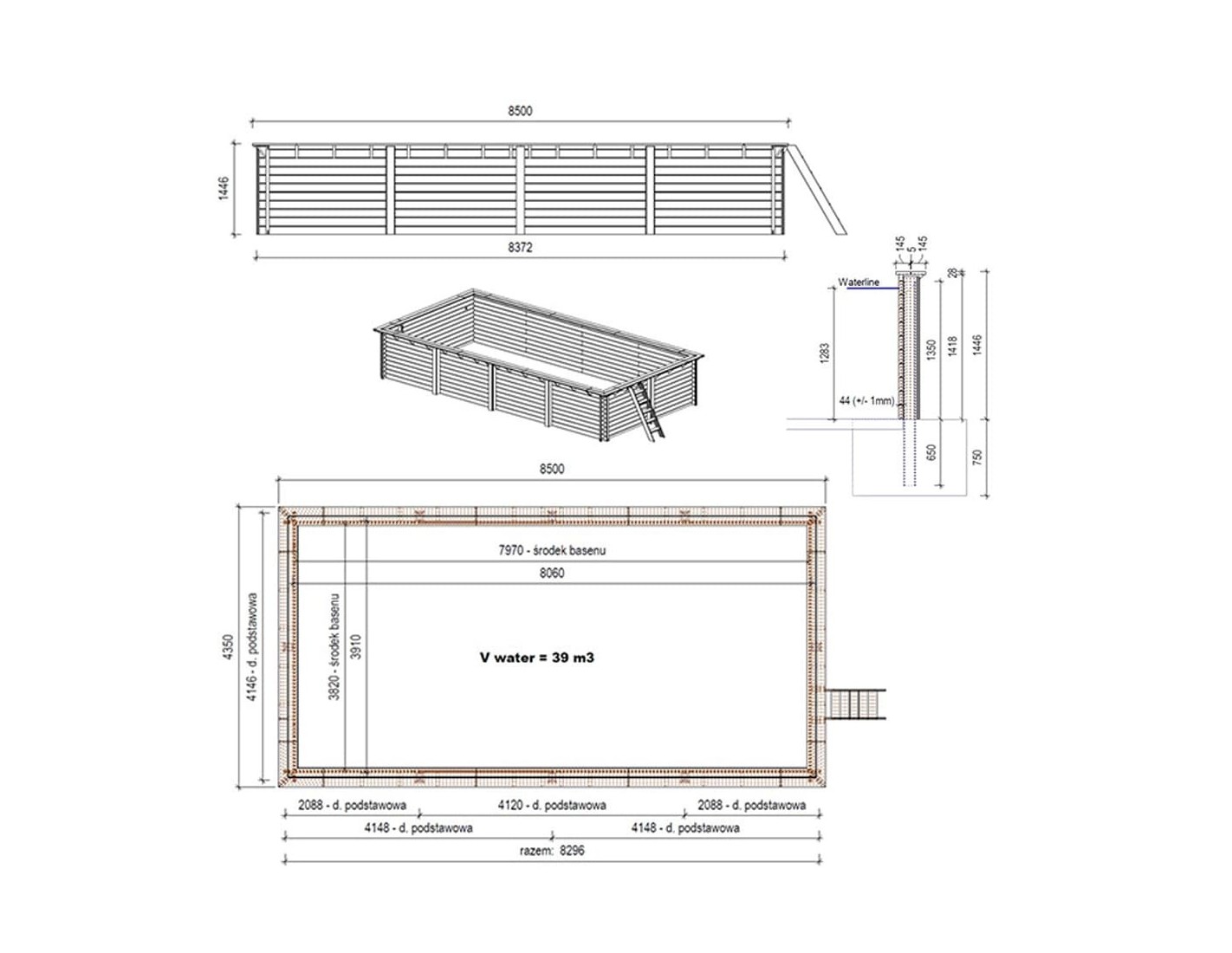 Ofrecemos una piscina de jardín de madera con dimensiones de 8.5 m x 4.35 m y una altura de 1.45 m, fabricada con madera de pino, tratada en color verde. El grosor de la tabla es de 44 mm (+/- 1 mm), lo que garantiza una construcción muy sólida de la piscina. El grosor de playa es de 28 mm.