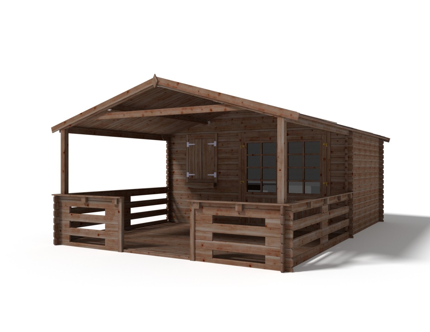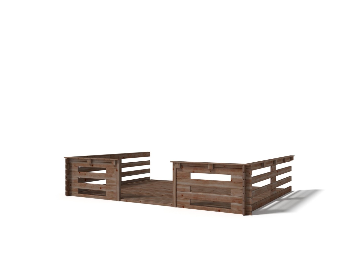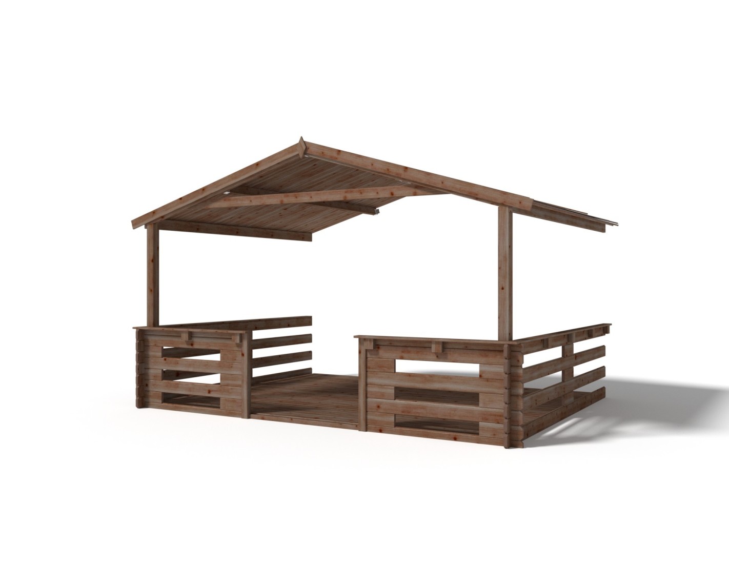 Terraza de madera DOM542 de superficie 12 m2, ancho de 4 m y profundidad de 3 m. La terraza es compatible con las casetas con ancho frontal de 4 m y espesor de 28 mm, ofrecidas por ALTANKA p.s.a. Gracias a las instrucciones de montaje adjuntas, la instalación no causa mayores problemas.