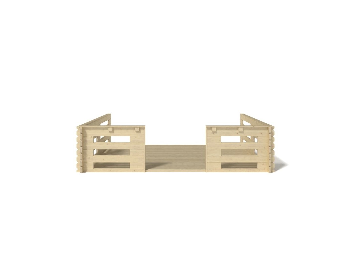 Terraza de madera DOM548 de superficie 12 m2, ancho de 4 m y profundidad de 3 m. La terraza es compatible con las casetas con ancho frontal de 4 m y espesor de 40 mm, ofrecidas por ALTANKA p.s.a. Gracias a las instrucciones de montaje adjuntas, la instalación no causa mayores problemas.